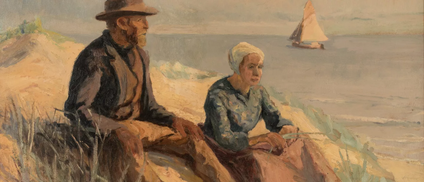 Fischerpaar in den Dünen, Öl auf Holz, 59 cm x 80 cm Werkmaß, signiert, restauriert, partiell retuschiert, minimal craqueliert, leichte...