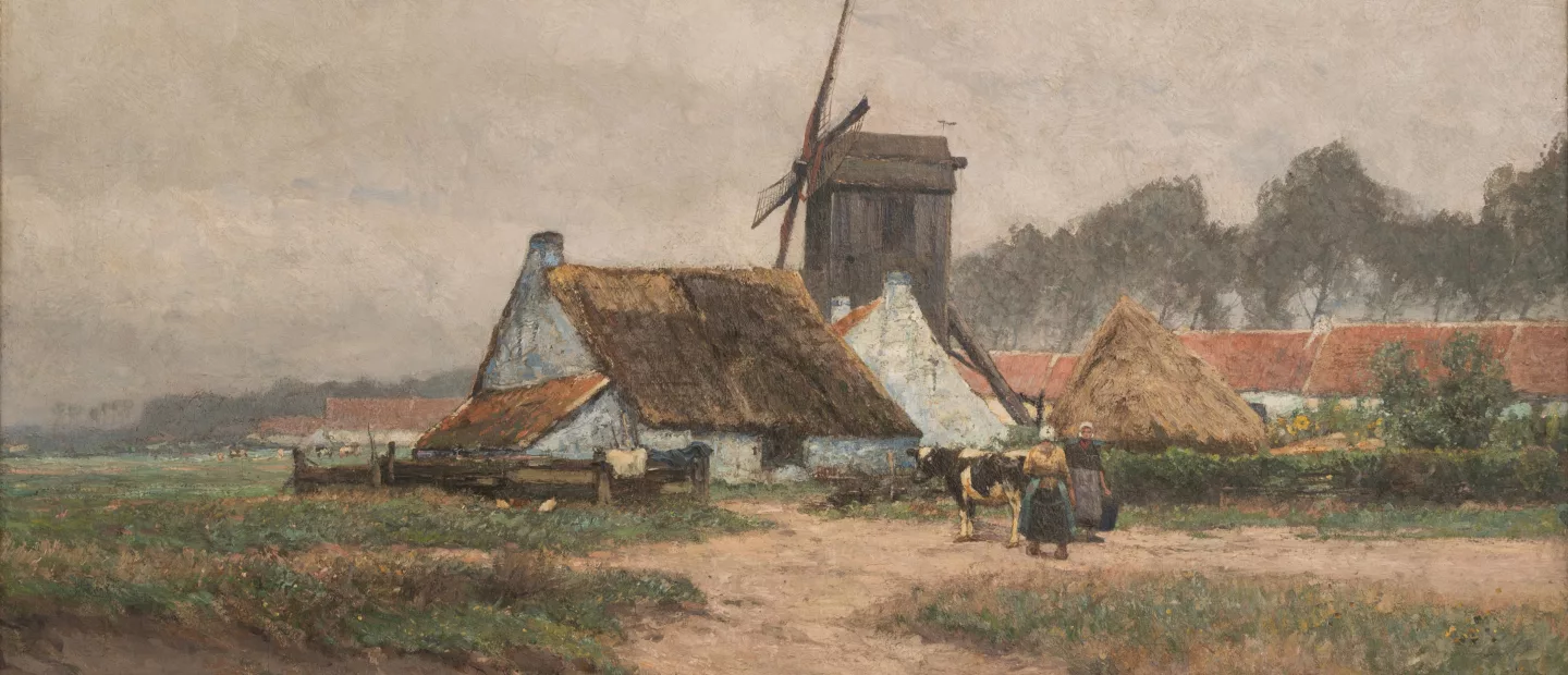 Flandrisches Gehöft mit Mühle, Öl auf Leinwand auf Platte aufgezogen, 74 cm x 109,5 cm Werkmaß, signiert, partiell craqueliert, kleine...
