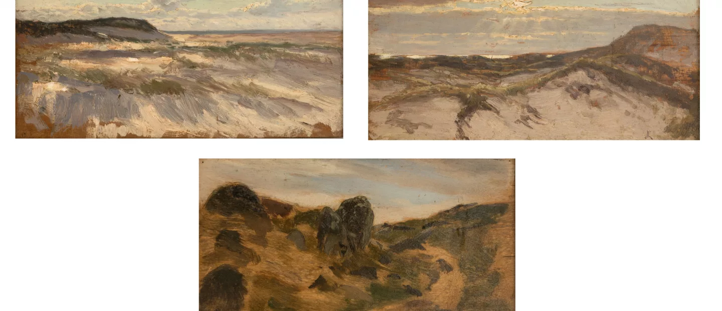 Ost- und Nordseedünen, drei Studien, jeweils Öl auf Holz, ca. 14 cm x 24,5 cm Werkmaße, verso jeweils Signaturstempel sowie 'F....