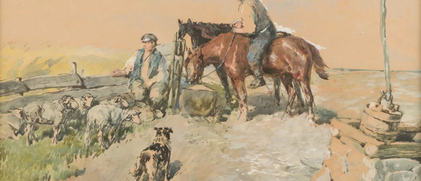 Reiter trifft Ziegenhirte, Aquarell auf Papier, 35,5 cm x 46,5 cm Sichtmaß, signiert, 08 datiert, montiert
