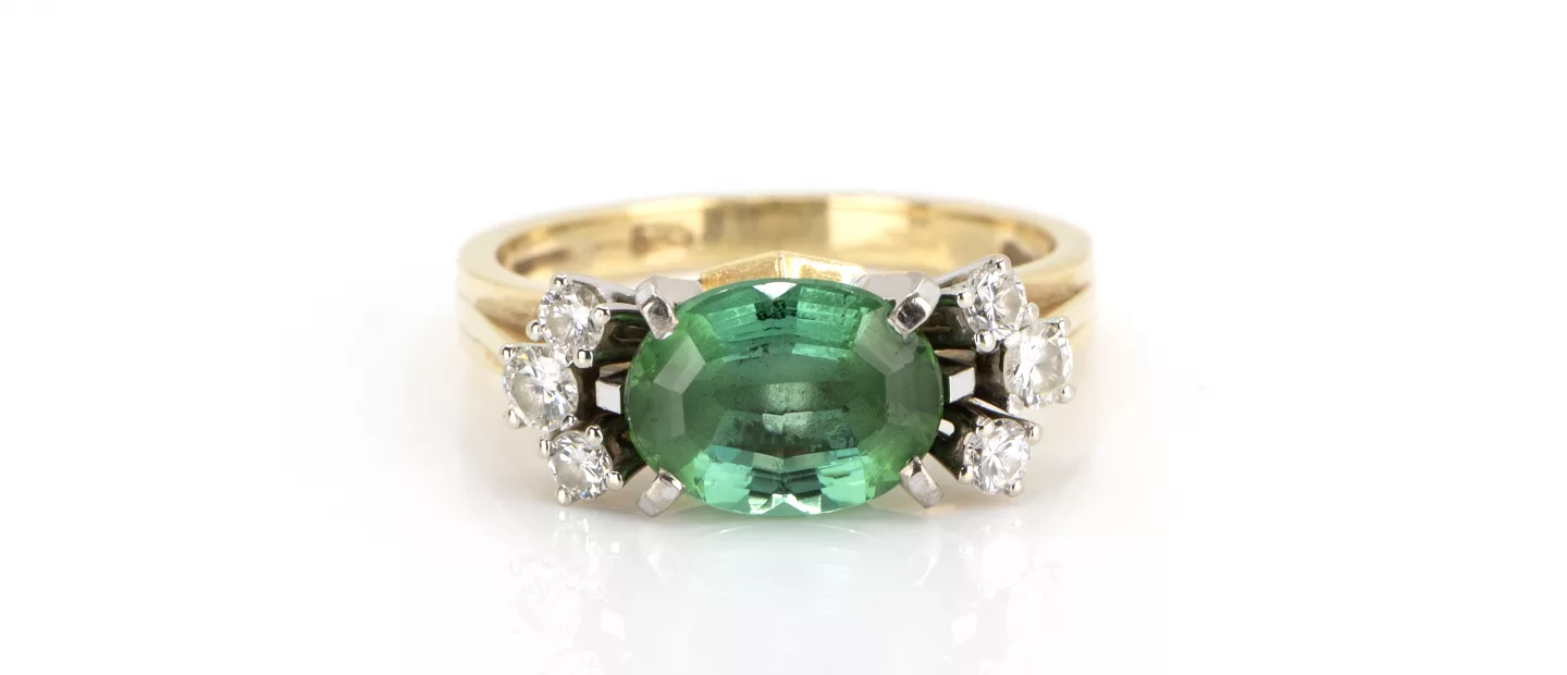585 Gelb- und Weißgold, punziert, 6 Diamanten im Brillantschliff, gesamt ca. 0,34 ct, H, vs, oval facettierter Turmalin ca. 2,65 ct, RW 59,...