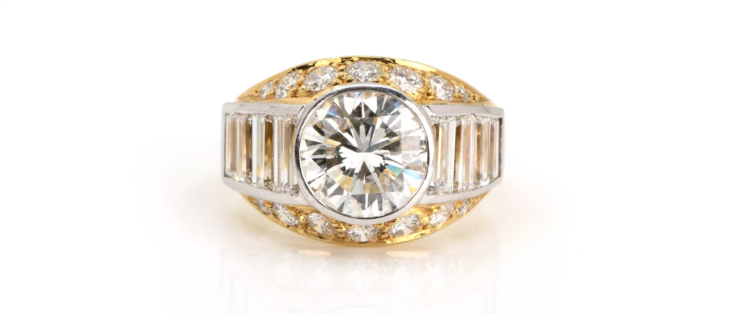 585 Gelb- und Weißgold, punziert, zentraler Diamant im Brillantschliff, ca. 2,75 ct, 8 Diamanten im Baguette- und 12 Diamanten im...