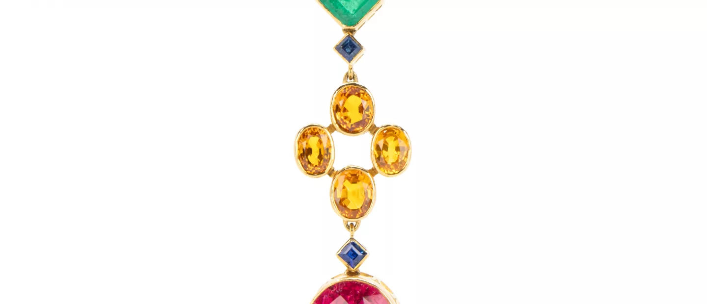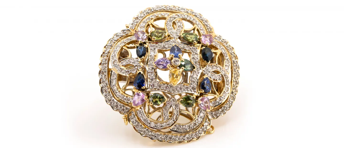 750 Gelbgold, punziert, ca. 150 Diamanten im Brillantschliff, gesamt ca. 1,50 ct, H, si, blaue, grüne, gelbe und rosa Saphire im...
