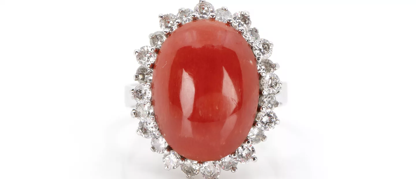 585 Weißgold, punziert, 24 Diamanten im Brillantschliff, gesamt ca. 1,00 ct, H, pi, Korallcabochon 16 x 12 mm, RW 56, Gewicht ca. 5,4 g,...