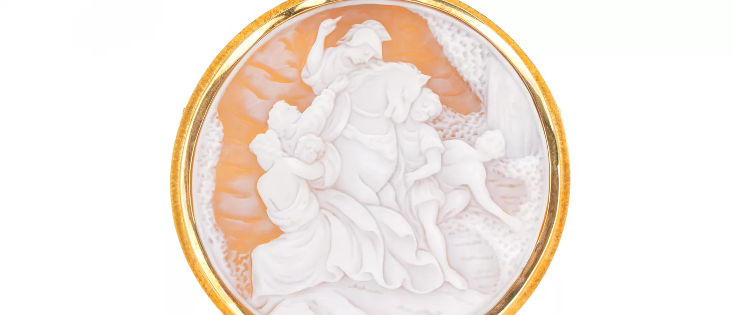 Fassung 585 Gelbgold, punziert, mit Öse auch als Anhänger tragbar, geschnitze Muschelgemme mit antikisierender Figurenstaffage, Ø 7,3 cm,...
