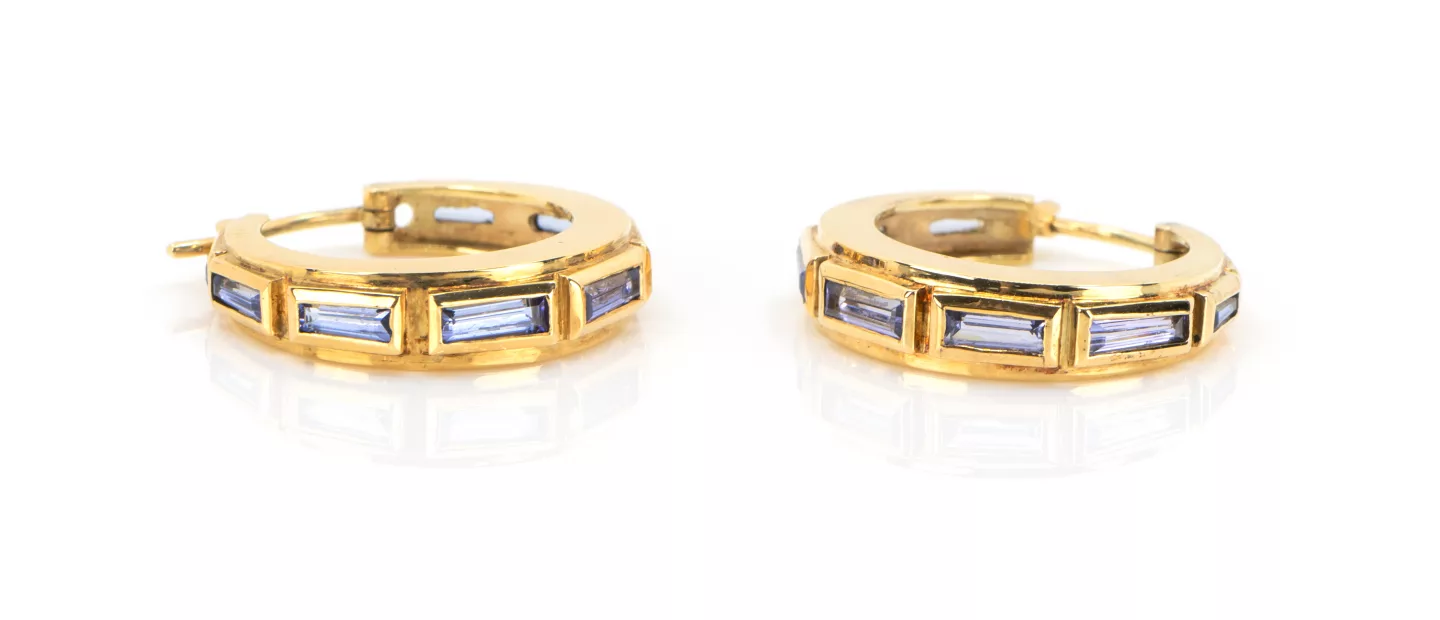 585 Gelbgold, punziert, jeweils 8 blau-violette Tansanite im Baguetteschliff, Höhe 2 cm, Gesamtgewicht ca. 8 g, 1 Tansanit mit kleiner...