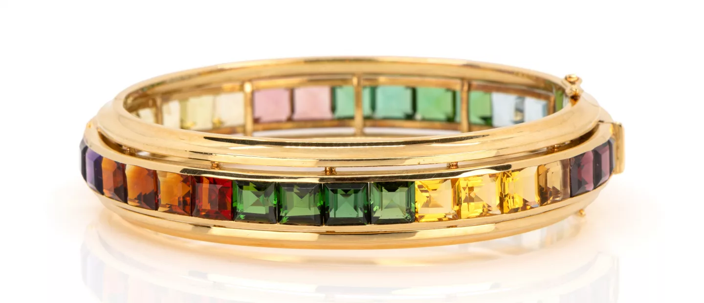 Juwelier Vitzthum, München, 750 Gelbgold, punziert, Aquamarine, Amethyste, Citrine, Turmaline und Granate im Carrèeschliff, Ø innen 5,9...
