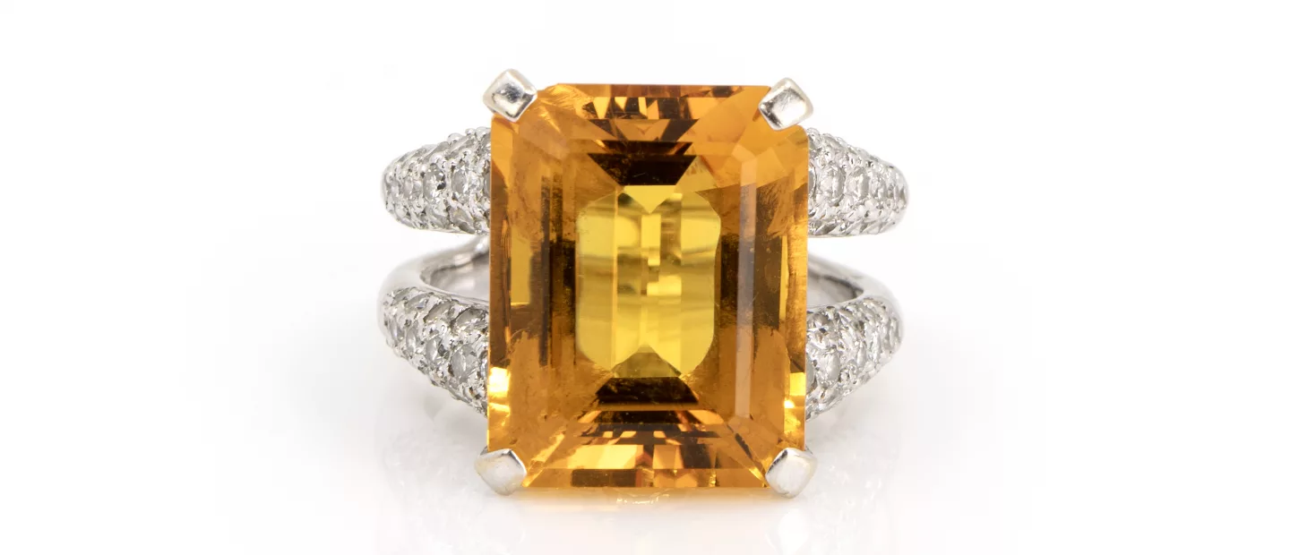 750 Weißgold, punziert, Diamanten im Brillantschliff, gesamt ca. 1,20 ct, G-H, vs, Citrin im Smaragdschliff, ca. 13,00 ct, RW 56, Gewicht...