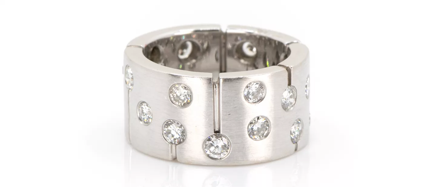 750 Weißgold, punziert, mit 21 Diamanten im Brillantschliff, gesamt ca. 2,00-2,10 ct, G-H, si, RW 55, Gewicht ca. 22 g, leichte Tragespuren