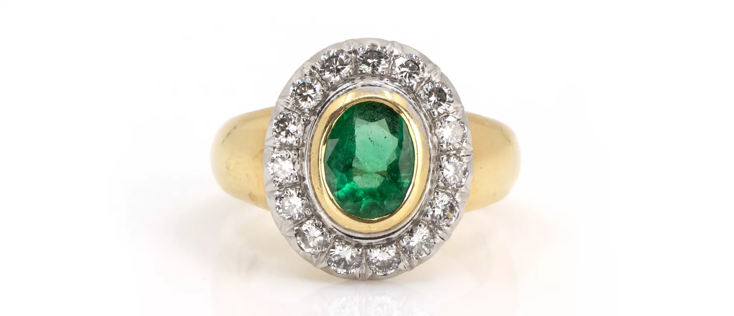 750 Gelb- und Weißgold, punziert, 12 Diamanten im Brillantschliff, gesamt 0,96 ct, E, vs1, Smaragd im Ovalschliff, Kolumbien, 1,20 ct, RW...