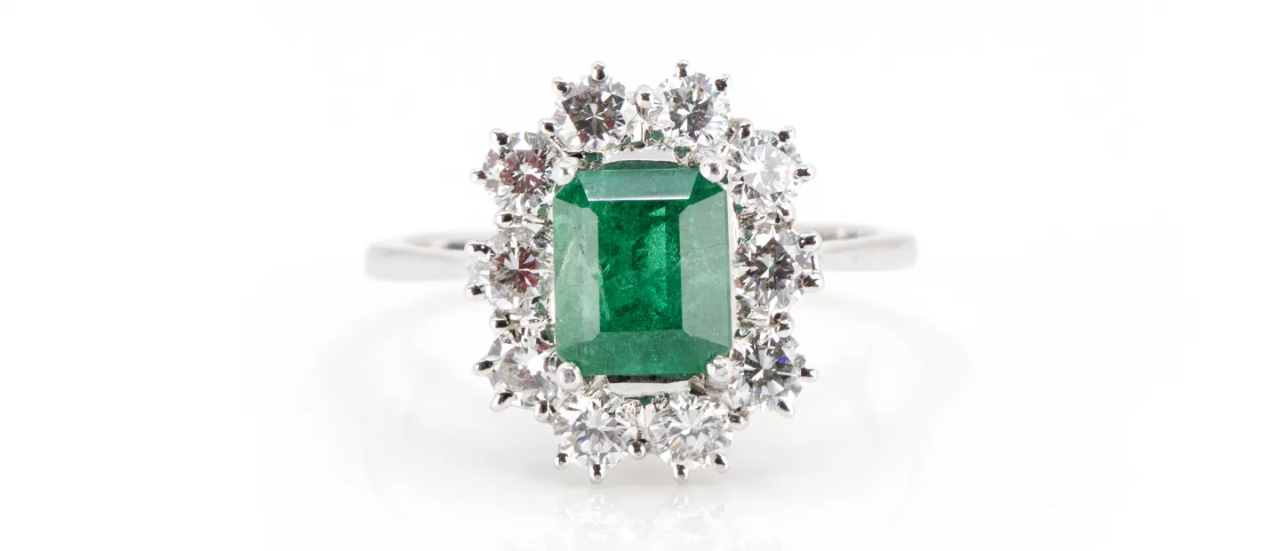 750 Weißgold, punziert, 10 Diamanten im Brillantschliff, gesamt ca. 1,00 ct, F-G, vvs-vs, facettierter Smaragd, Kolumbien, ca. 1,65 ct, RW...