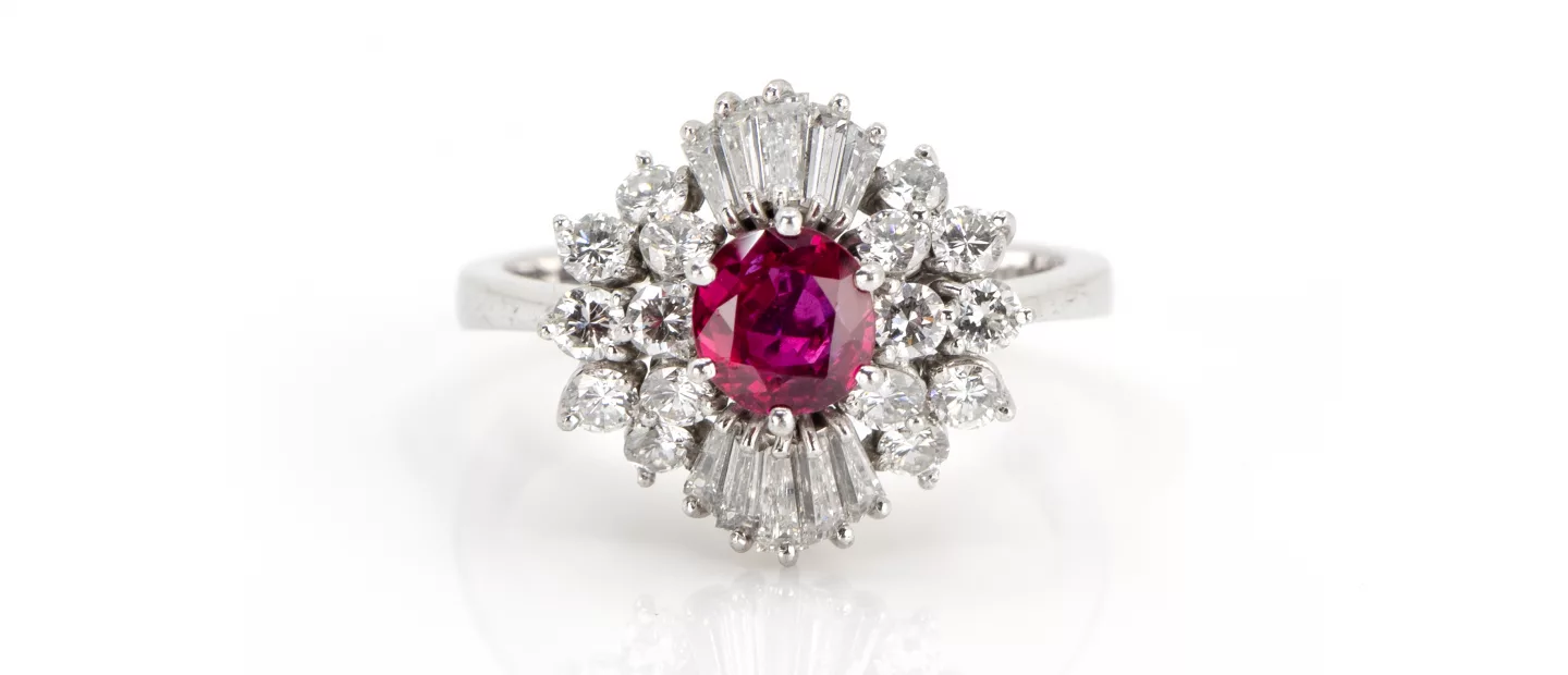 750 Weißgold, punziert, 26 Diamanten im Brillant- und Baguetteschliff, gesamt 1,26 ct, punziert, F-G, vvs-vs, rund facettierter Rubin 0,90...