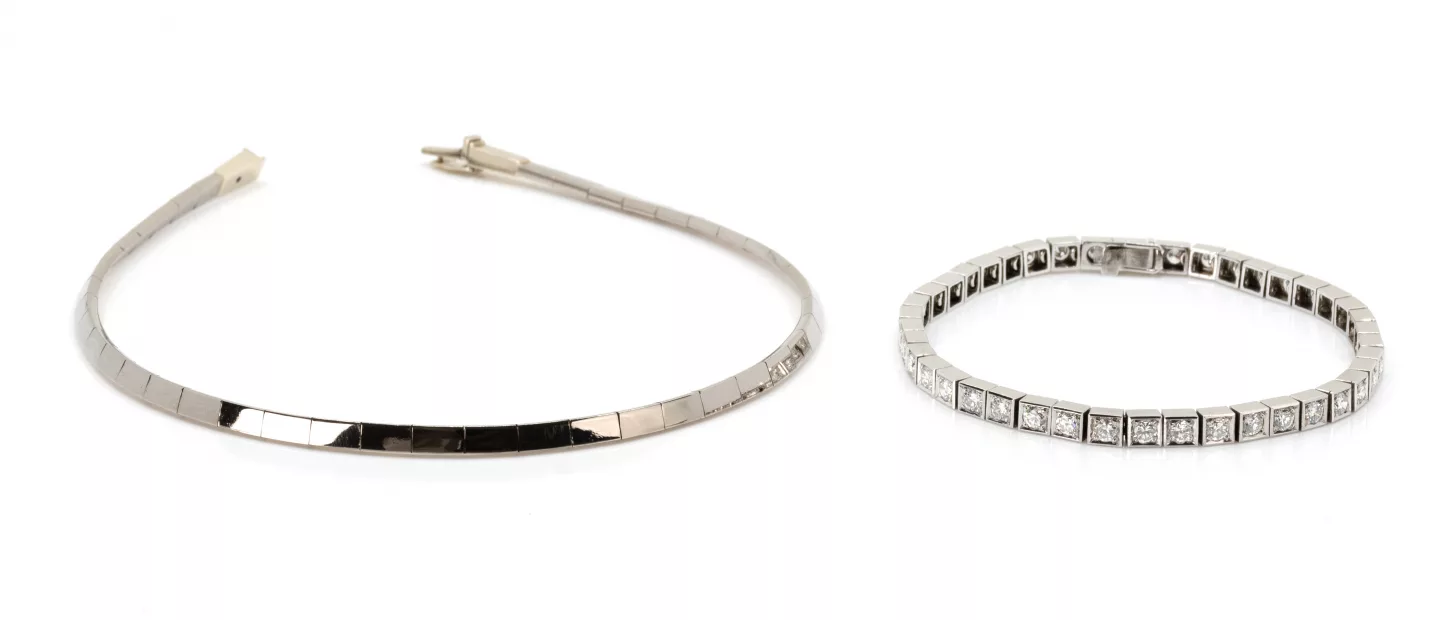 585 Weißgold, punziert, 42 Diamanten im Brillantschliff, gesamt ca. 2,10 ct, G-H, vvs-vs, kann als Armband und durch Steckverschlüsse auch...