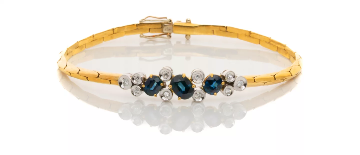 Saphir-Diamantarmband: 750 Gelb- und Weißgold, punziert, 10 Diamanten im Brillantschliff, gesamt ca. 0,10 ct, H, vvs-vs, 3 Saphire im...