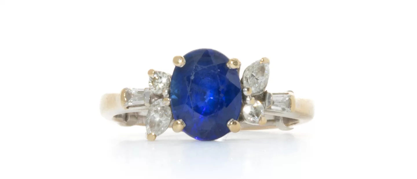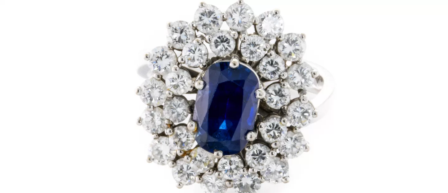 Saphir-Ring mit in der Höhe variierender Diamanten-Entourage