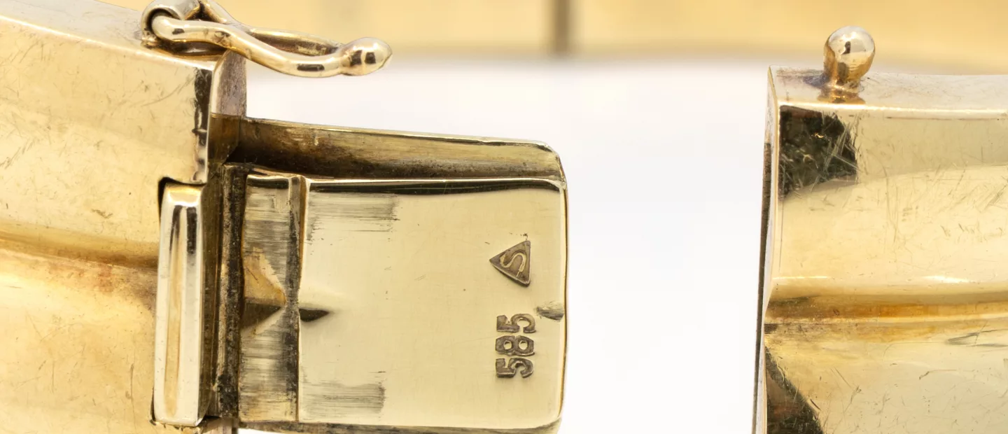 Armreif: 585 Gelbgold, punziert, Länge ca. 17,4 cm, Gesamtgewicht ca. 45,8 g, leichte Gebrauchsspuren in Form von Kratzern und Bereibu