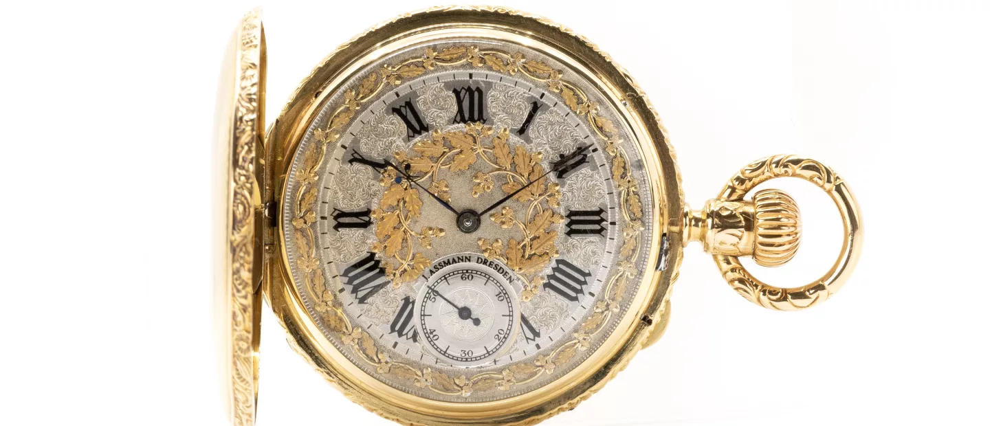 Anfang 20. Jh., Handaufzug, Gehäuse 585 Gelbgold, punziert, Gehäuse mit Gravur, Zwischendeckel Metall, Gehäuse-Nr. 605921, weißes...