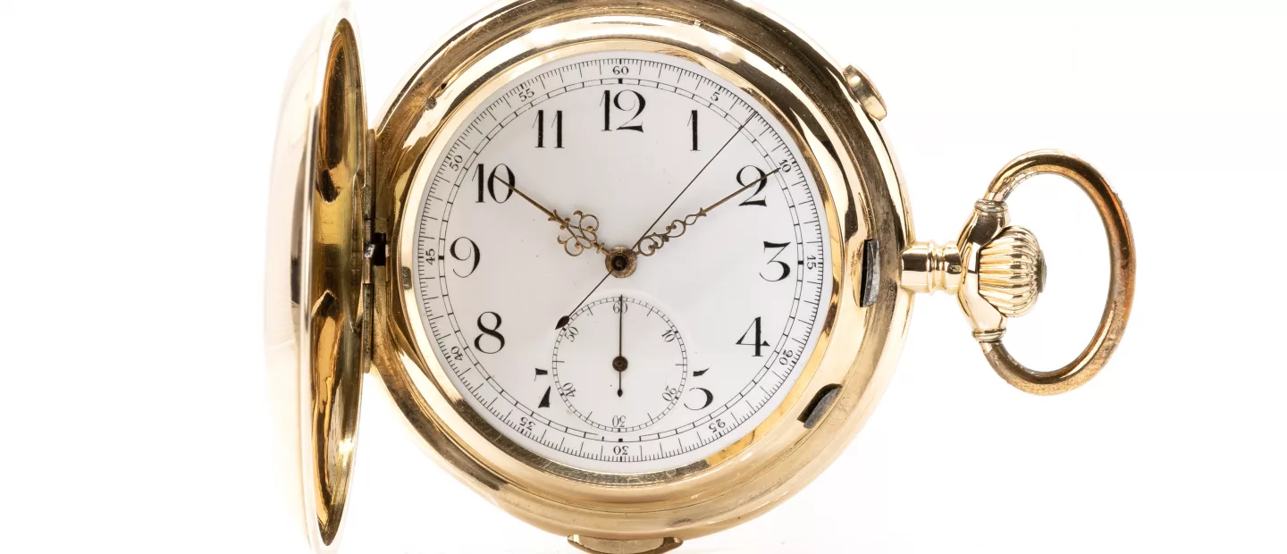 Schweiz, um 1905, Handaufzug, 1/4 Repetition und Chronograph, vergoldetes Brückenwerk mit Kronenaufzug unter Glasschutz, Ankergang mit...