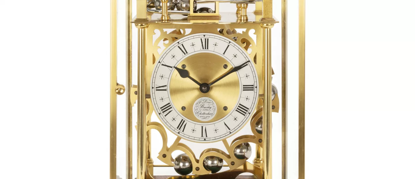 Dove Bazeley, England, Cheltenham, 20. Jh., Gehäuse Glas, Uhrwerk Messing, vergoldet, Zifferblatt Stahl und Messing, Zinn-Zifferring mit...