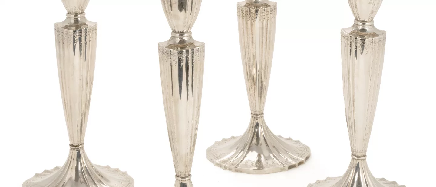 4-tlg., Marcus & Co, New York, um 1900, 925 Silber, punziert, jeweils 1-flammiger Standleuchter mit kanneliertem, konischen Säulenschaft...