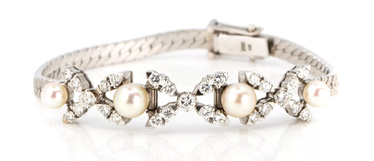 Perl-Diamant-Armband: um 1960, 750 Weißgold, punziert, 4 Zuchtperlen, umgeben von ca. 1,32 ct Diamanten, H, VVSI-VSI, Länge ca. 16...