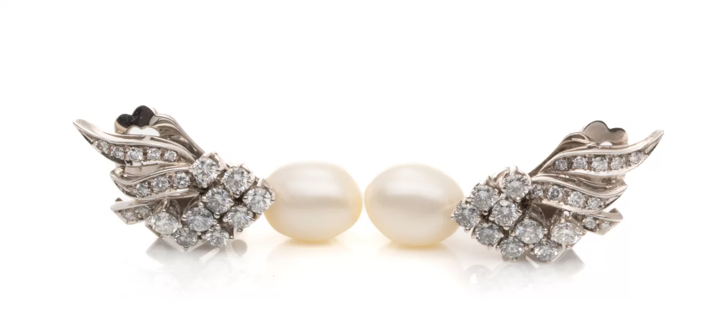 Paar Perl-Diamant-Ohrclips: 2-tlg., 585 Weißgold, punziert, insgesamt 42 Diamanten im Brillantschliff, gesamt ca. 1,65 - 1,70 ct, H,...