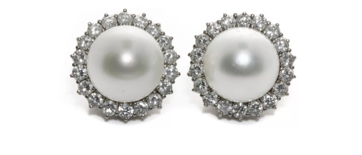 Perl-Ohrclips mit Diamanten-Entourage: 750 Weißgold, punziert, Zuchtperlen umgeben von einer Diamanten-Entourage im Brillant-Schliff,...