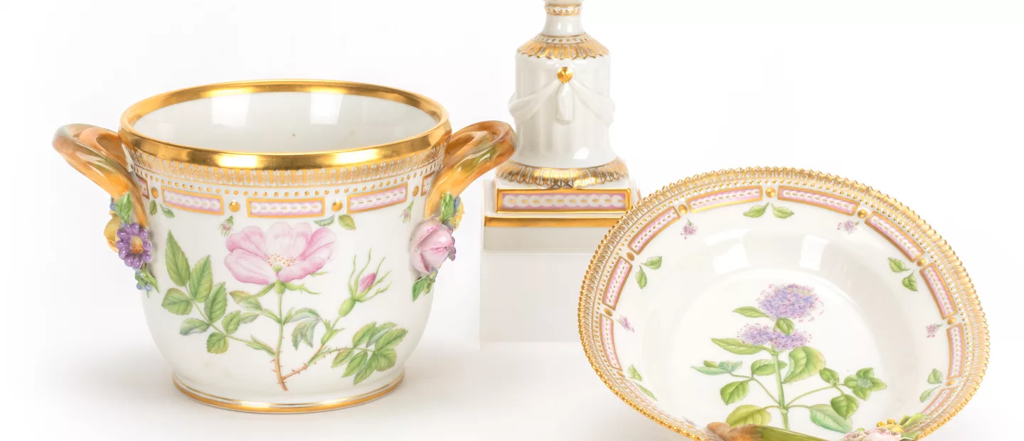 3-tlg., Royal Copenhagen, Dänemark, Kerzenleuchter Anfang 20. Jh., die beiden übrigen 1980-1984, Porzellan, weiß, farbig bemalt und gold...