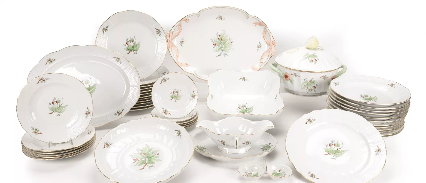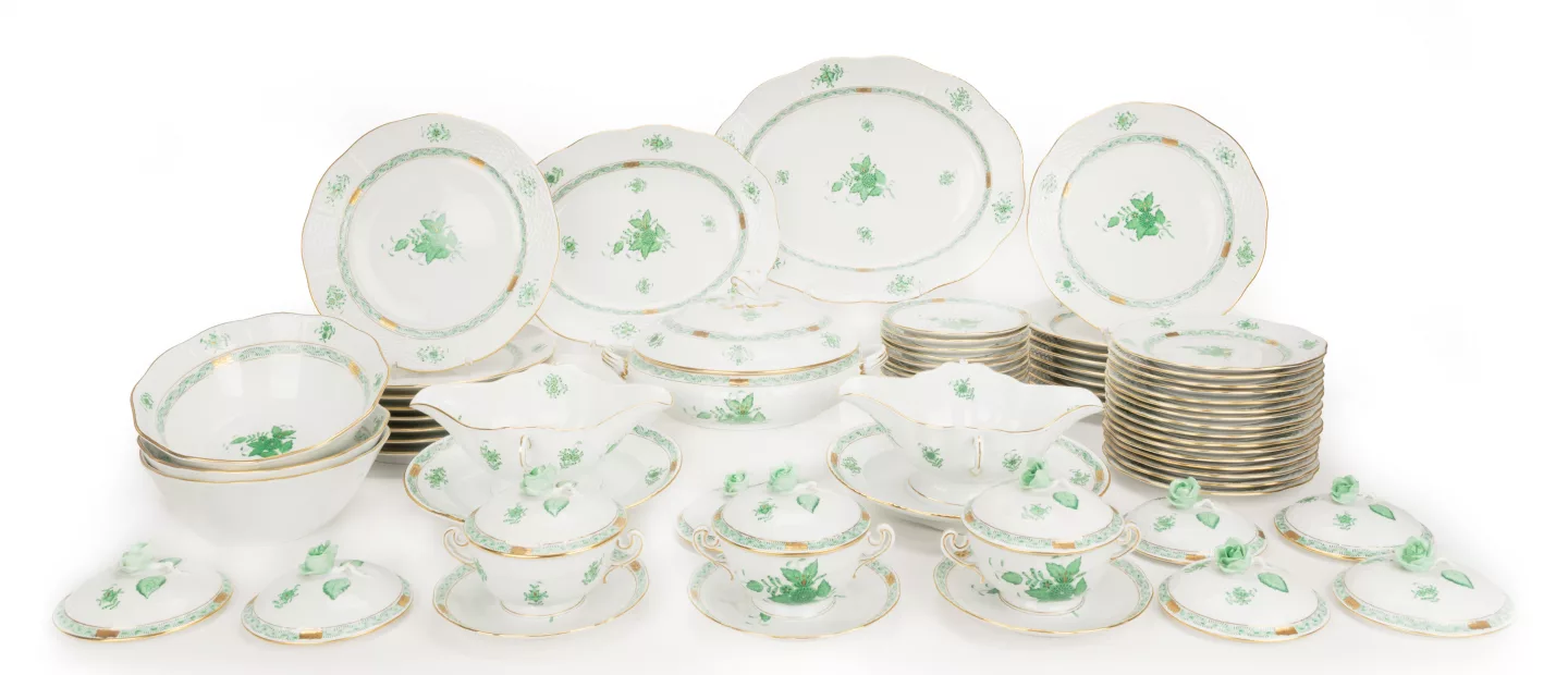74-tlg., Herend, Ungarn, Mitte/Ende 20. Jh., Porzellan, weiß, grün bemalt, gold staffiert, 16 Speiseteller, Ø 25 cm, 16 Vorspeiseteller,...