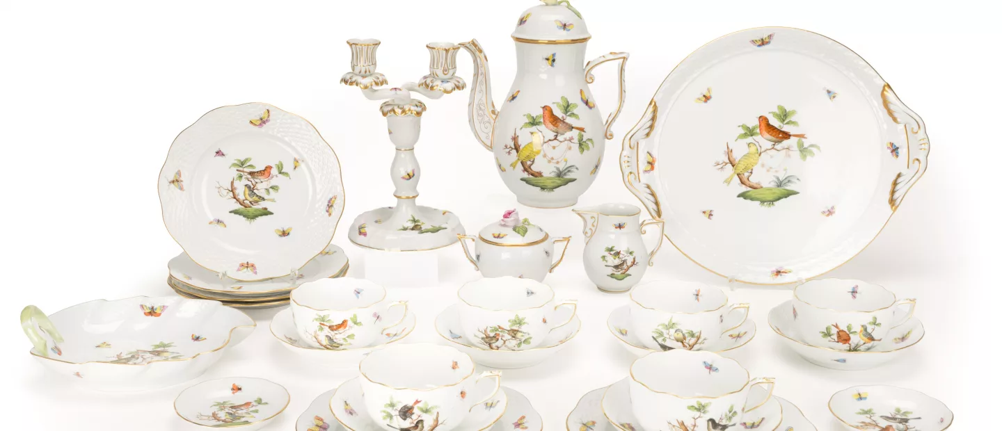44-tlg., Herend, Ungarn, Mitte/Ende 20. Jh., Porzellan, weiß, farbig bemalt und gold staffiert, 12 Speiseteller, Ø 25,5 cm, 6 Brotteller,...