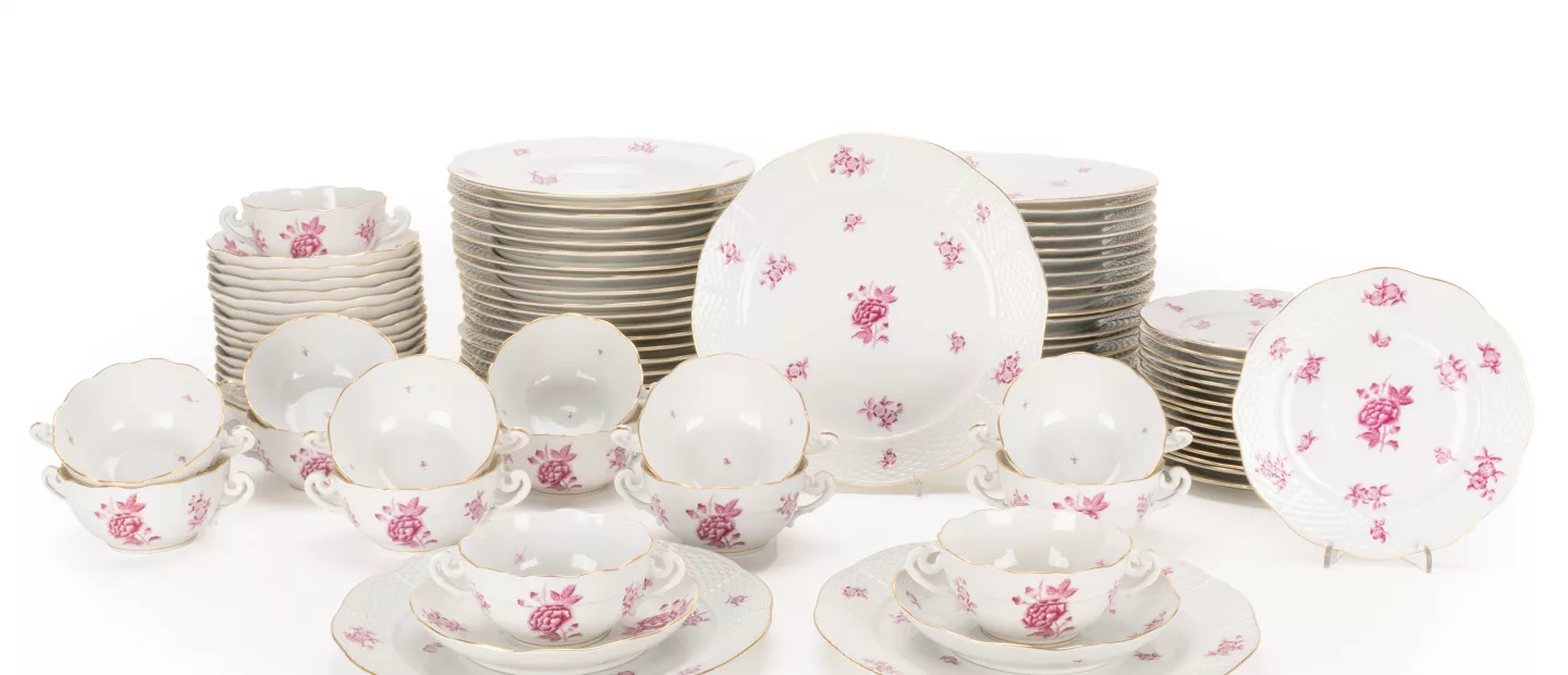 100-tlg., Herend, Ungarn, 1940/1941, Porzellan, weiß, monochrom purpur bemalt und gold staffiert, 22 Speiseteller, Ø 25 cm, 18...