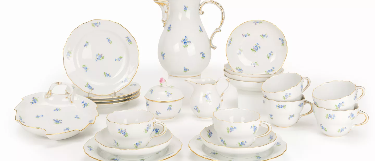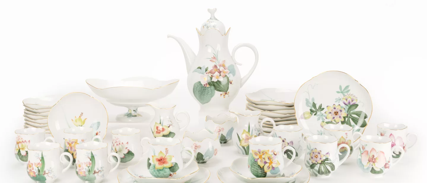 42-tlg., Meissen, 1991, Entwurf von Ludwig Zepner (1931-2010), Form großer Ausschnitt, Orchideen- und Wasserpflanzen-Dekor mit Goldrand,...