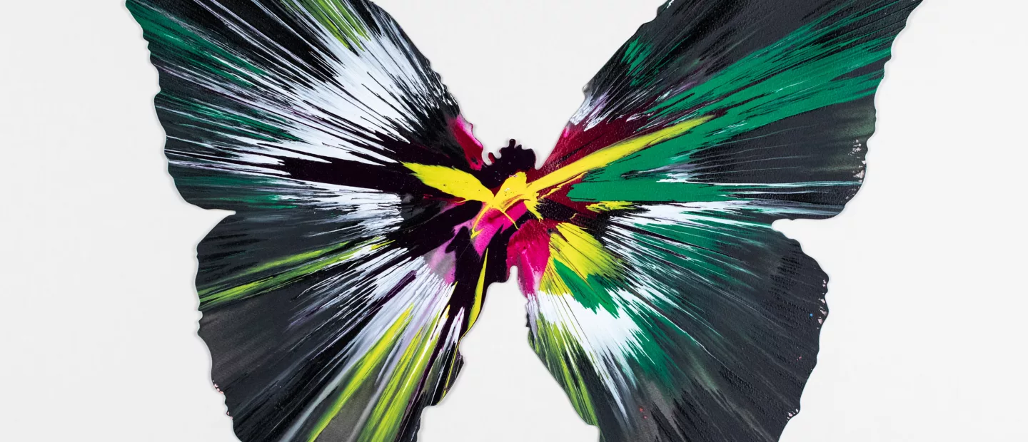 Damien Hirst (1965 Bristol) (F): Butterfly Spin Painting, Mischtechnik auf Papier, 54,5 × 68,5 cm, rückseitig im Druck signiert, 2009...