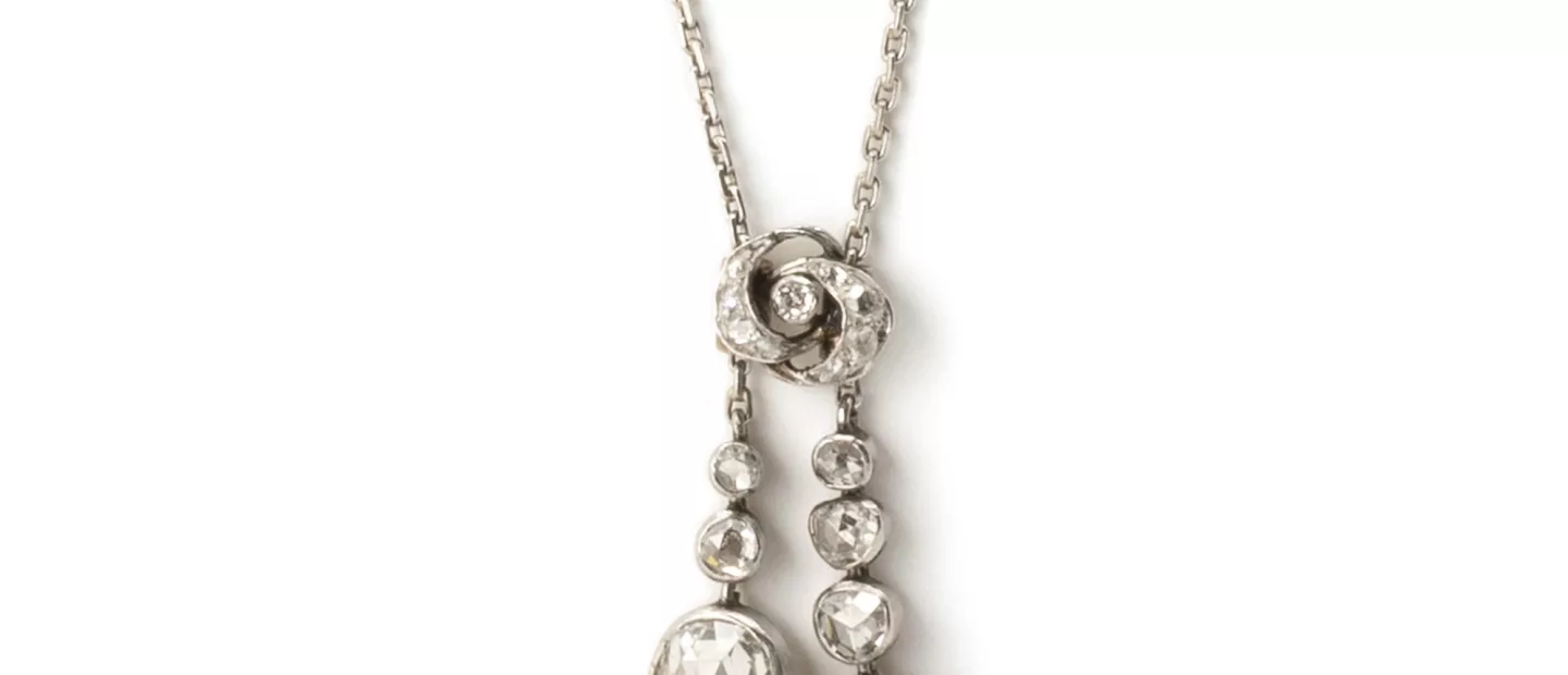 Lavallière-Collier: 585 Weißgold, getestet, Diamanten im Antwerpener Rosenschliff, je ca. 0,5 ct, M, SI, umgeben von ca. 11 Diamanten...