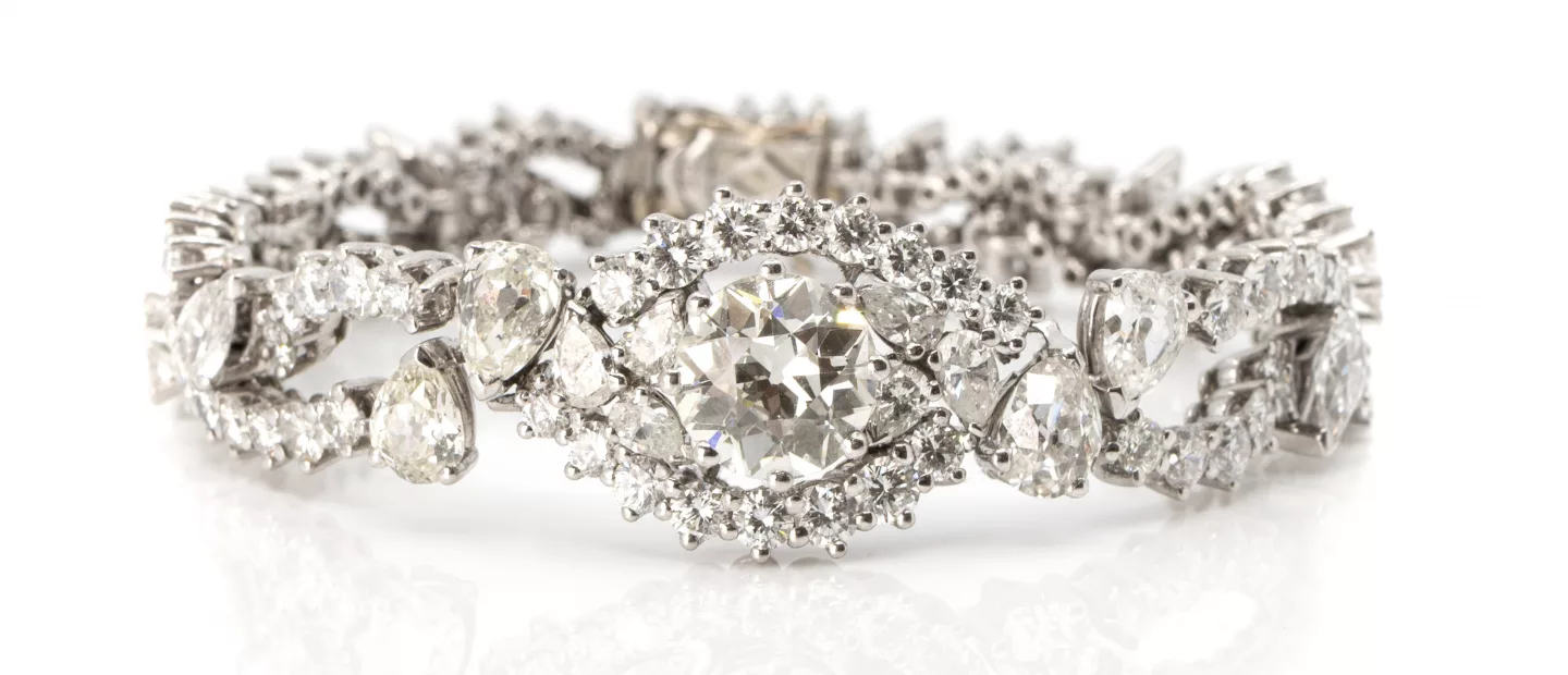 Diamantarmband: um 1960, 750 Weißgold, getestet, Herstellerpunze 'SC', Mittlerer Diamant im modernisiertem Altschliff 4,05 ct,...