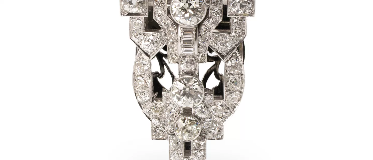 Art Deco Diamant-Brosche: um 1940, 750 Weißgold, punziert, Diamanten im Altschliff, oberer Stein ca. 1,5 ct, SI-P1, J, mittlerer Stein...