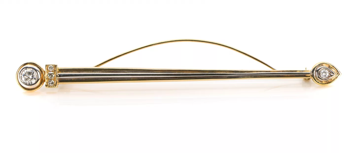 Diamant-Stabbrosche: 585 Gelb- und Weißgold, geprüft, 5 Diamanten im Brillantschliff, gesamt ca. 0,72 ct, I-K, si-pi, Länge 10,5 cm,...