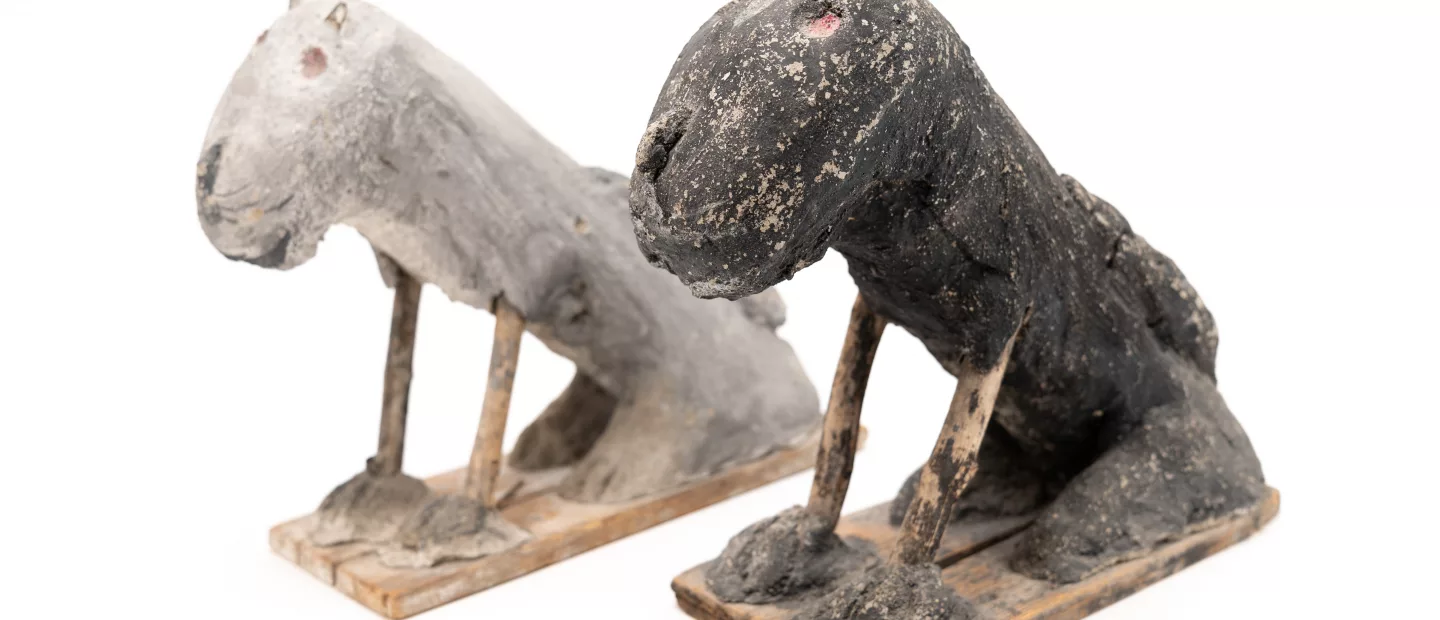 Erich Bödeker (Recklinghausen 1904 - 1971): Sitzende Hunde, 2-tlg., Beton über Holz- und Eisenkonstruktion, partiell farbig gefasst,...