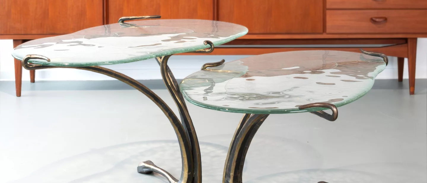 Paar brutalistische Couchtische, im Stil von Lothar Klute: 2. Hälfte 20. Jh., Bronze, goldbraun patiniert, Glas, ein Tisch AF oder AL...