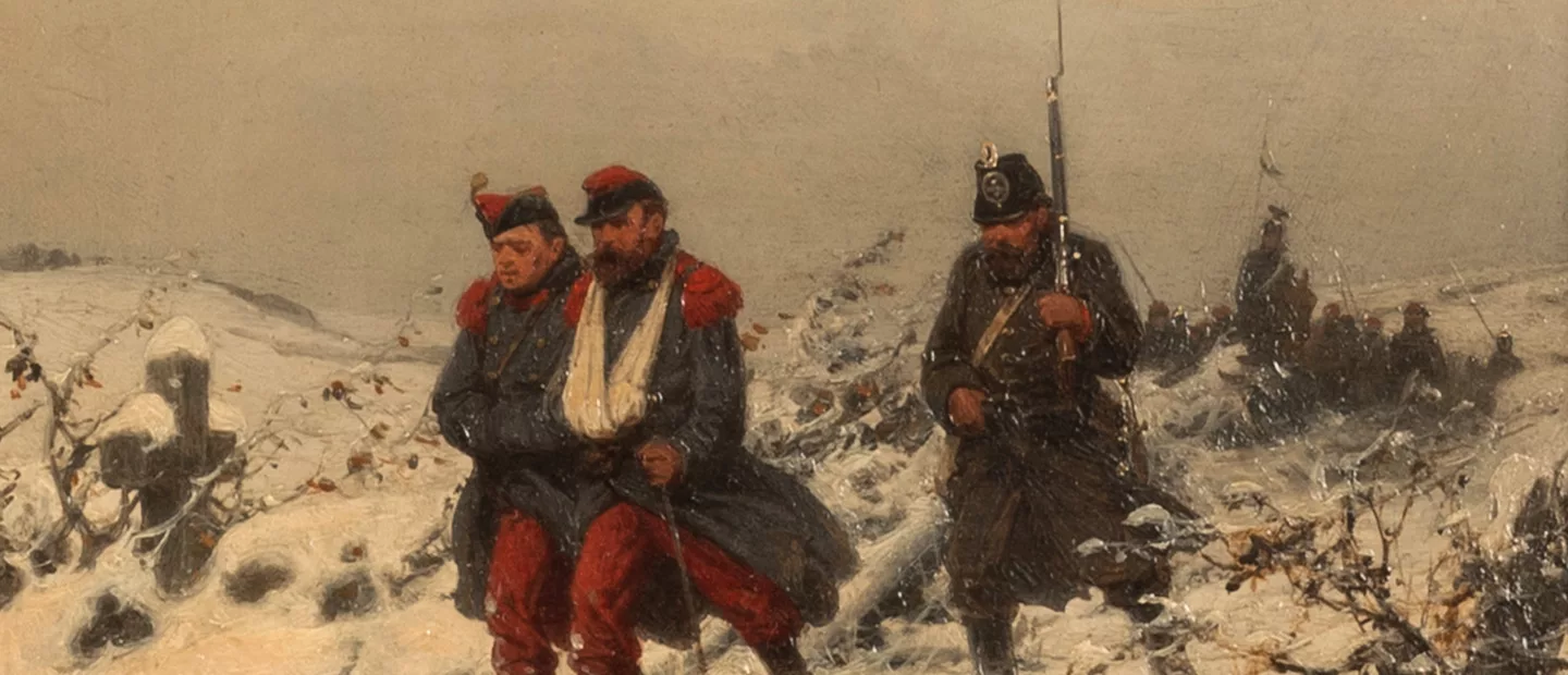 Christian I. Sell (1831 Altona - 1883 Düsseldorf): Verwundete, französische Soldaten werden durch die preußische Armee abgeführt,...