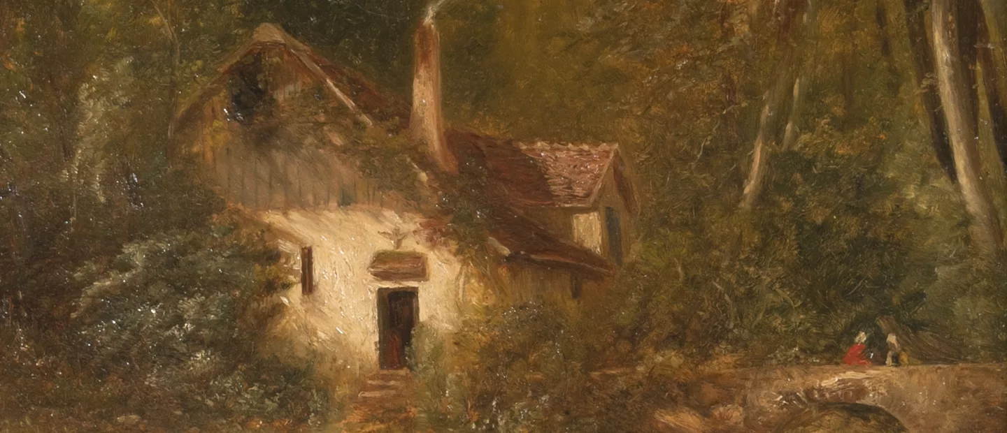 Paul Huet (1803 Paris - 1869 ebenda): Haus im Wald, Öl auf Holz, 26,5 cm x 35 cm Werkmaß, signiert, partiell minimal berieben