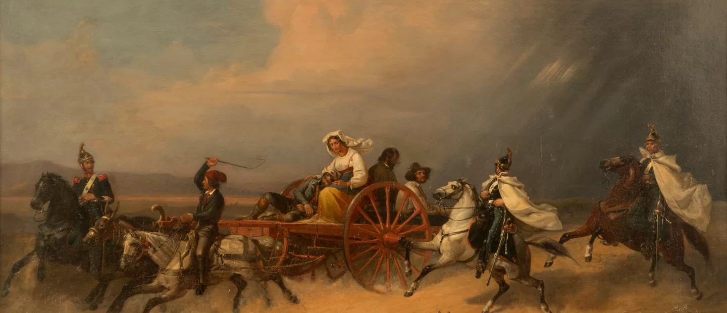 Ludwig Vogel (1788 Zürich - 1879 ebenda): 'Die Flucht vor den Eidgenossen. Pferdefuhrwerk mit Verwundeten flieht in Begleitung von...