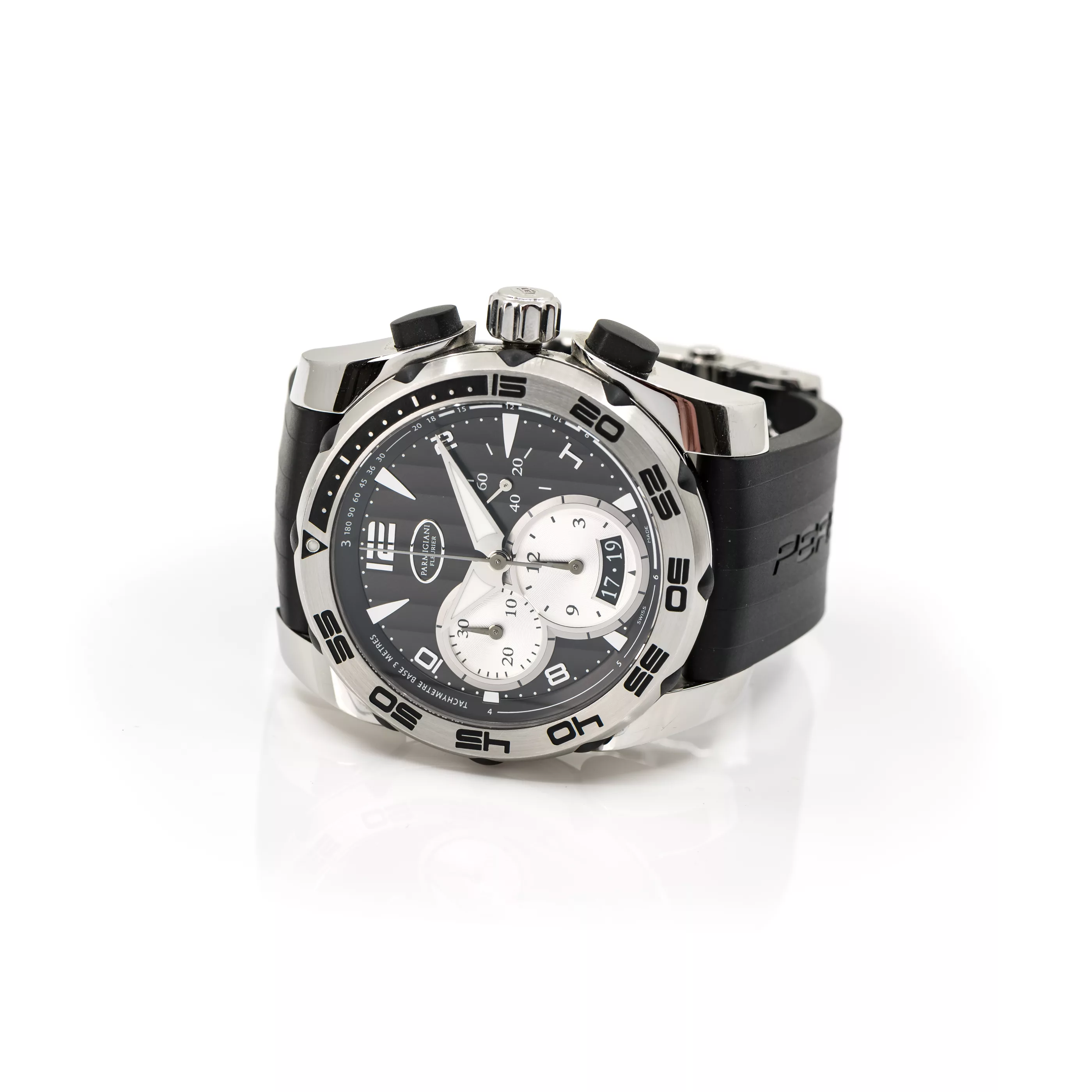 Full set, year 2008, automatic, chronograph, rotating bezel, under-glass tachymeter scale, date display, 12-hour counter, 30-minute counter, small second, screw-down crown, movement no. 33907 | ref. no. 601396-06, case steel, diameter 45 mm, original strap, rubber, original folding clasp, steel, length 15,5 cm, total weight approx. 159,1 g, functional, tested, condition good, condition and functionality checked by our master watchmaker, with original box, outer packaging and papers, outer packaging very good, box very good, guarantee certificate, instruction manual, original wrist strap/merchandise with pouch and outer packaging enclosed, note: The buyer's premium is 14,28% incl. VAT. For the use of the online bidding consoles there is an additional fee of 3% plus VAT (3.57%).