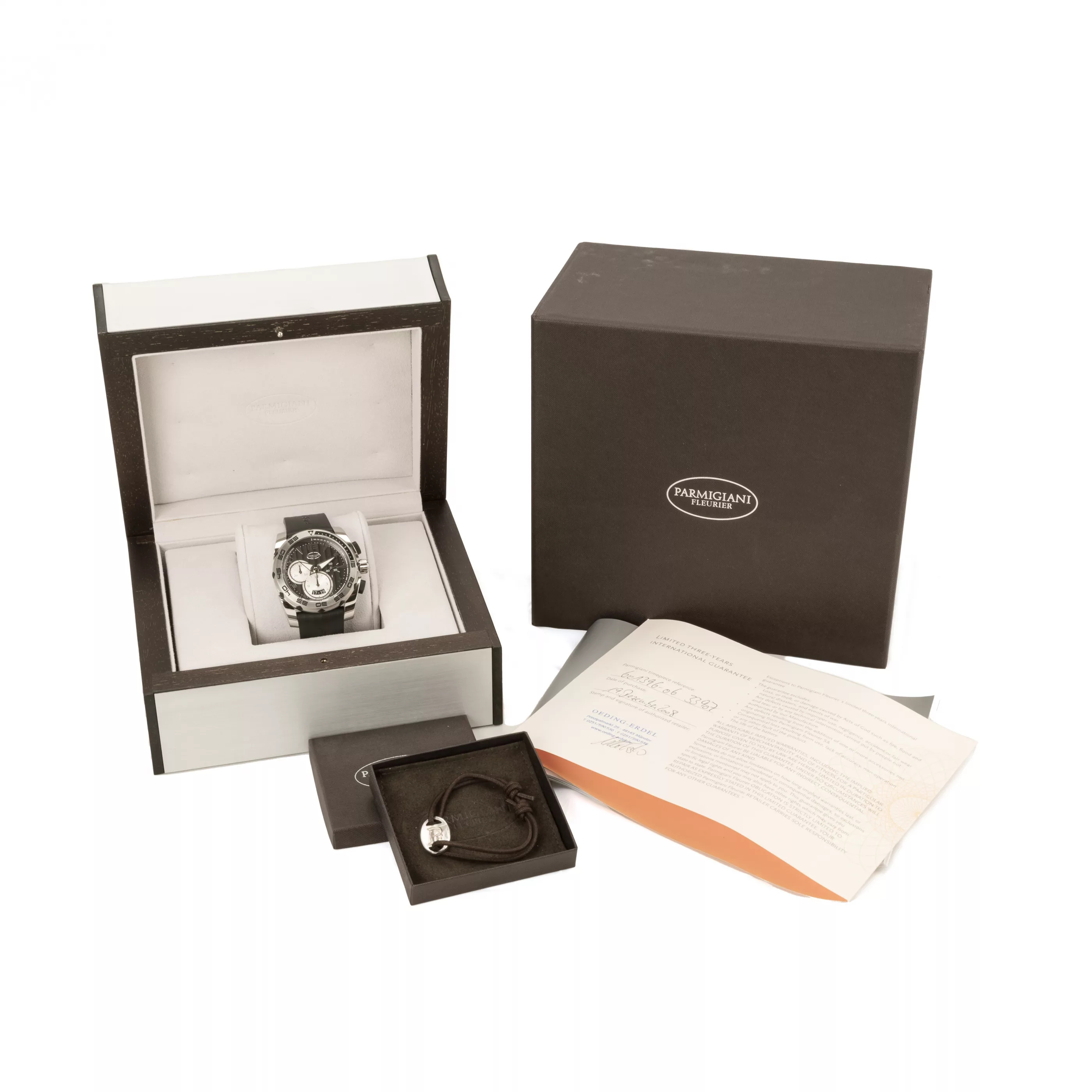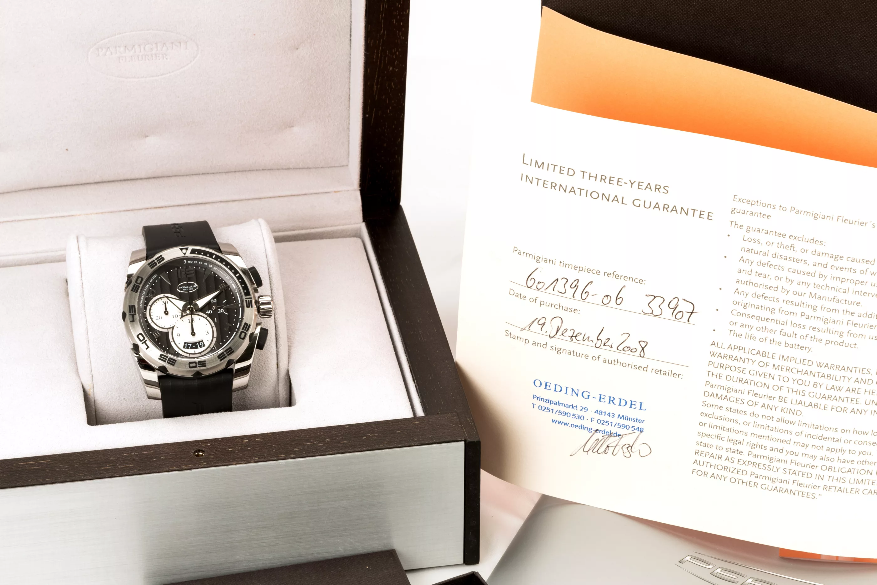 Full-Set, Jahr 2008, Automatik, Chronograph, drehbare Lünette, Unterglas Tachymeterskala, Datumsanzeige, 12-Stunden-Zähler, 30-Minuten-Zähler, kleine Sekunde, verschraubte Krone, Werk-Nr. 33907 | Ref.-Nr. 601396-06, Gehäuse Stahl, Durchmesser 45 mm, Original-Armband, Kautschuk, Original-Faltschließe, Stahl, Länge 15,5 cm, Gesamtgewicht ca. 159,1 g, Funktion gangbar, geprüft, Zustand gut, Zustand und Funktionalität durch unseren Uhrmachermeister geprüft, mit Original-Box, -Umverpackung und -Papieren, Umverpackung sehr gut, Box sehr gut, Garantiezertifikat, Bedienungsanleitung, Original Handgelenksarmband/Merchandise mit Beutel und Umverpackung anbei,
