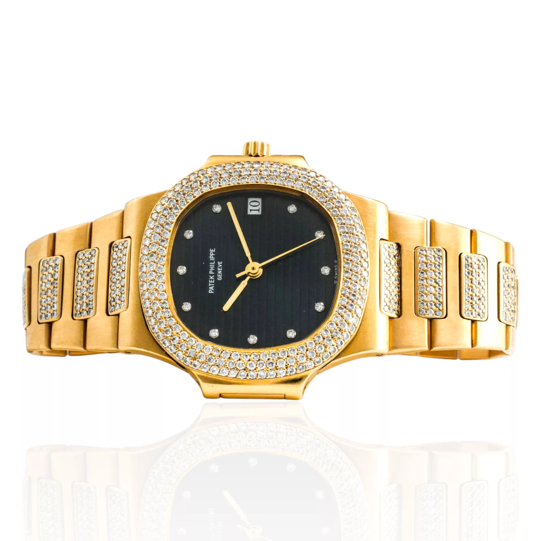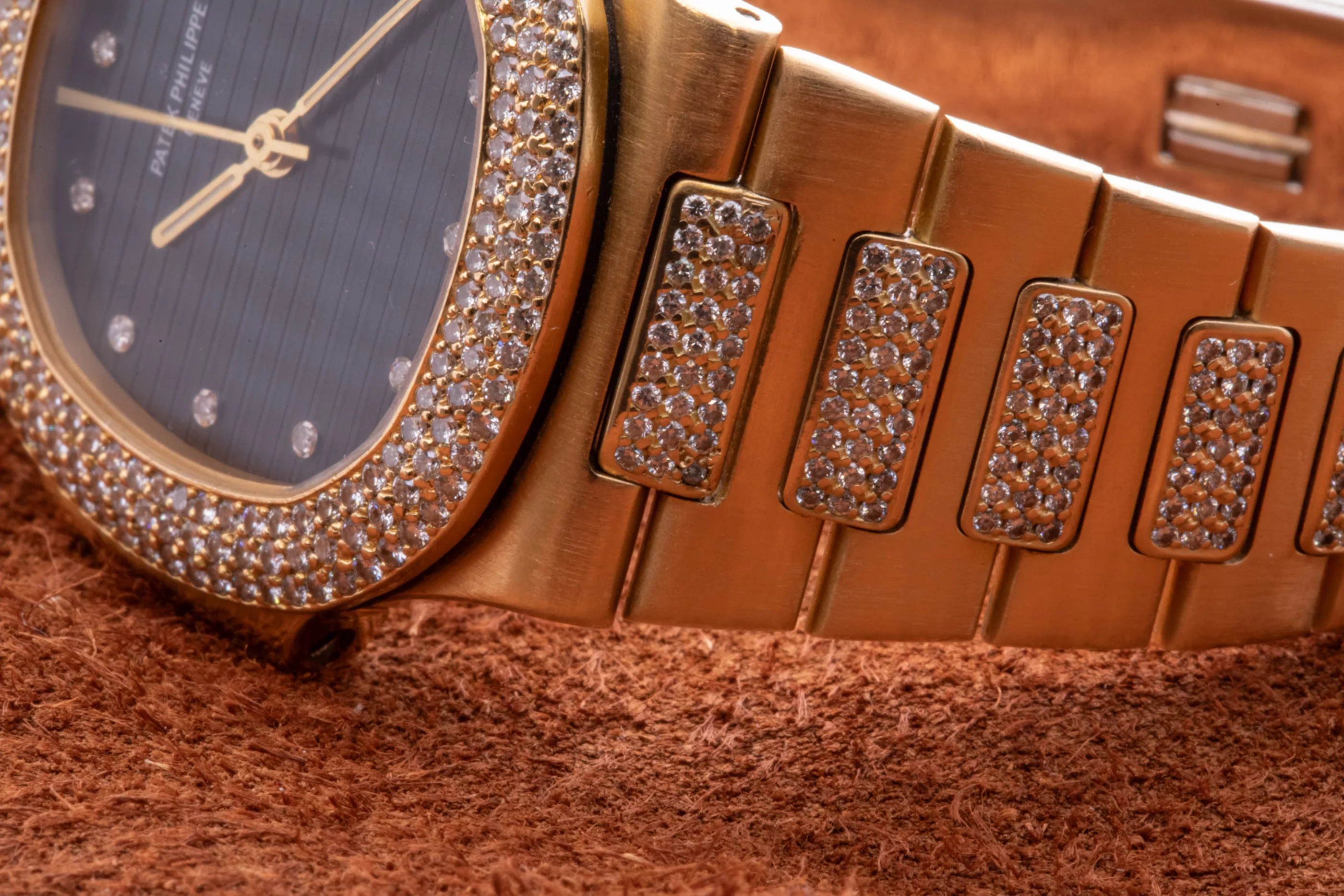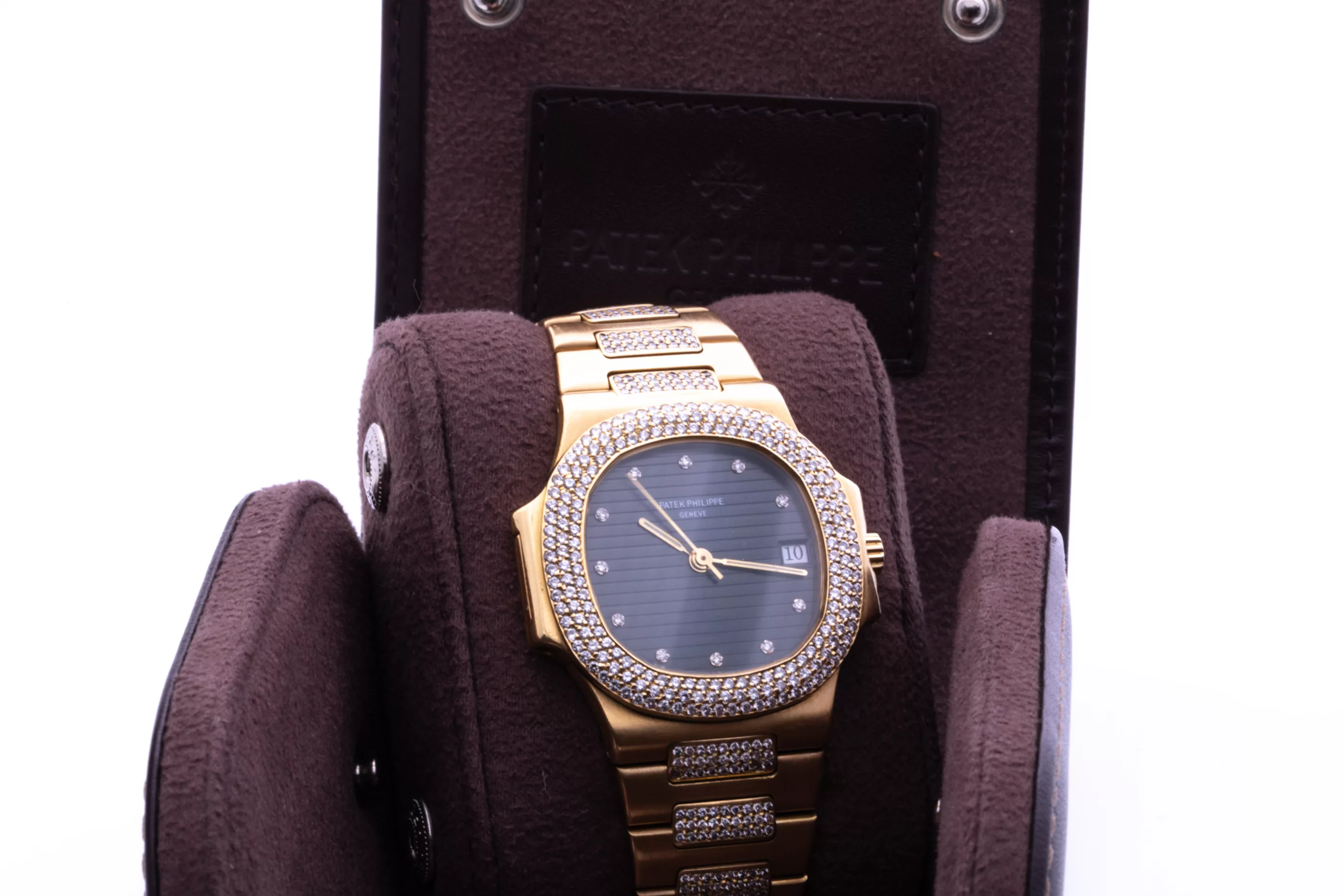 Patek Philippe, Nautilus, case diameter 3.7 cm, automatic, 750 yellow gold, hallmarked, luminous hands, diamond indices, diamond-set bezel and bracelet, brilliant-cut diamonds, approx. 4.28 ct in total, H, VVS-VSI, case diameter 3.7 cm, original folding clasp, length approx. 19.5 cm, total weight approx. 124.2 g, function working, tested, very well maintained condition, minimal wear in places, as well as fine scratches on the underside of the case and on the folding clasp, with original box and without papers, includes a replacement link with diamond setting