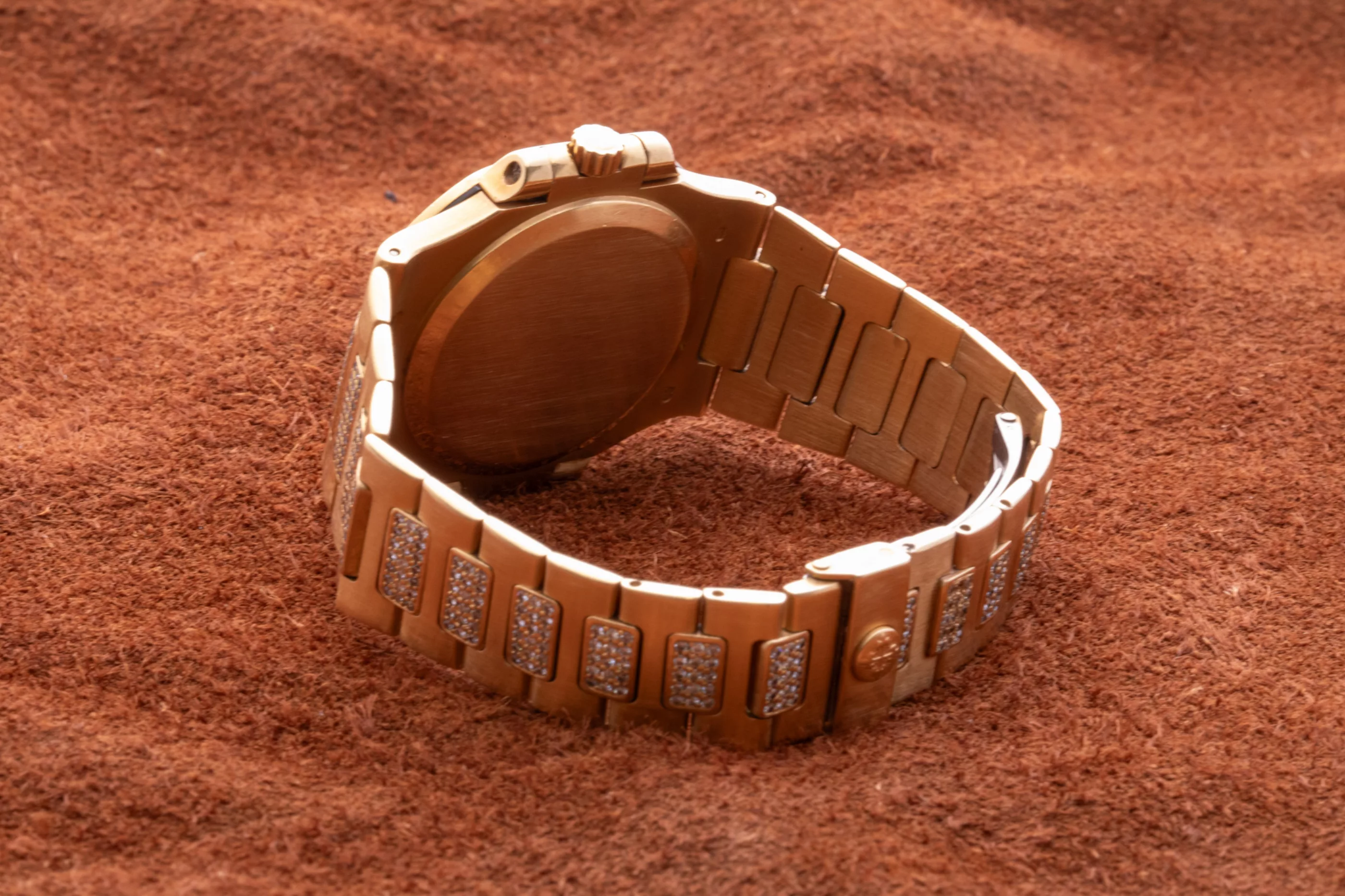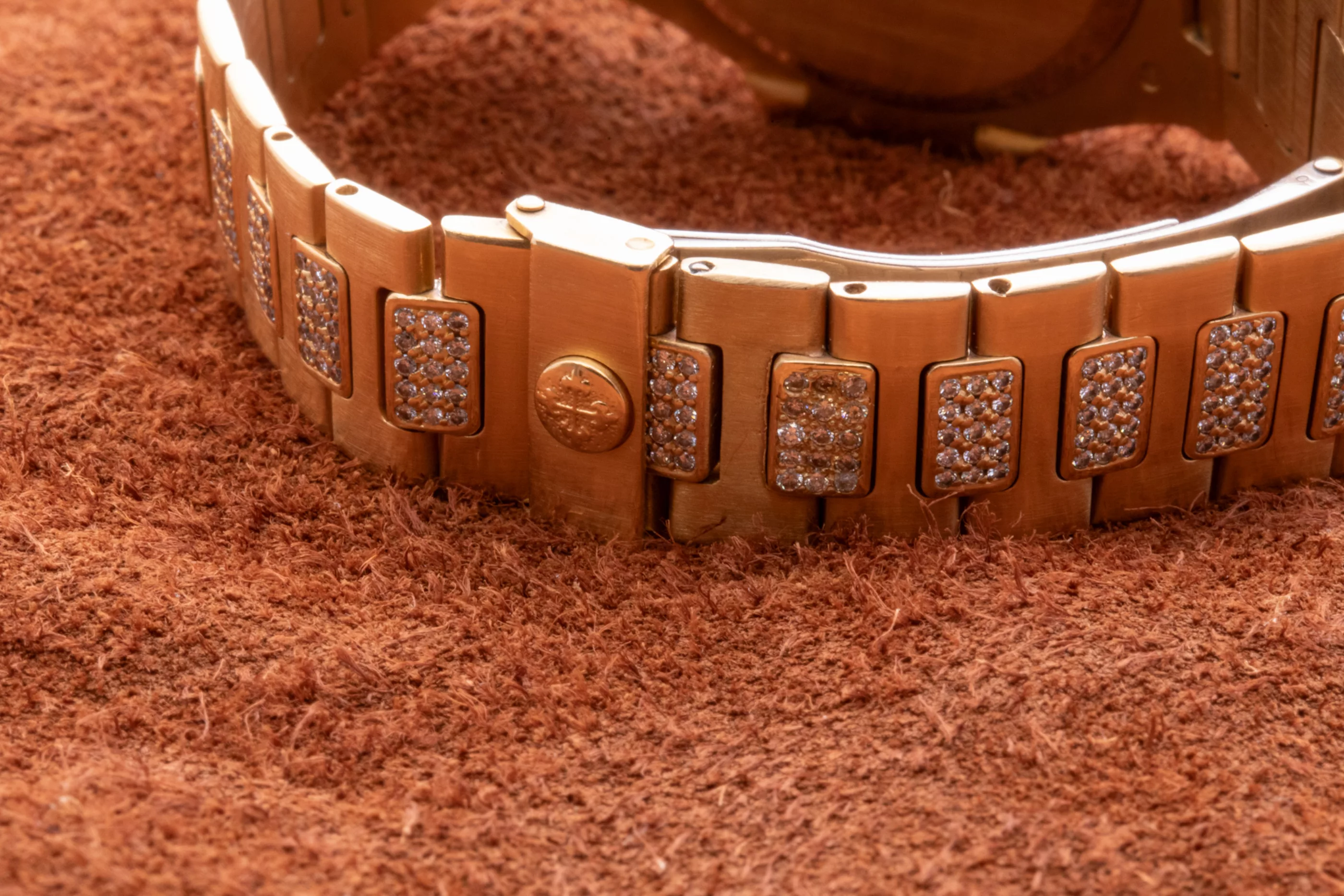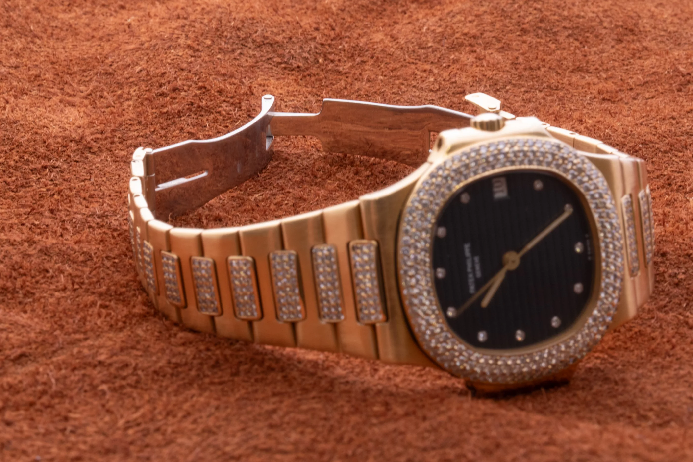Patek Philippe, Nautilus, case diameter 3.7 cm, automatic, 750 yellow gold, hallmarked, luminous hands, diamond indices, diamond-set bezel and bracelet, brilliant-cut diamonds, approx. 4.28 ct in total, H, VVS-VSI, case diameter 3.7 cm, original folding clasp, length approx. 19.5 cm, total weight approx. 124.2 g, function working, tested, very well maintained condition, minimal wear in places, as well as fine scratches on the underside of the case and on the folding clasp, with original box and without papers, includes a replacement link with diamond setting