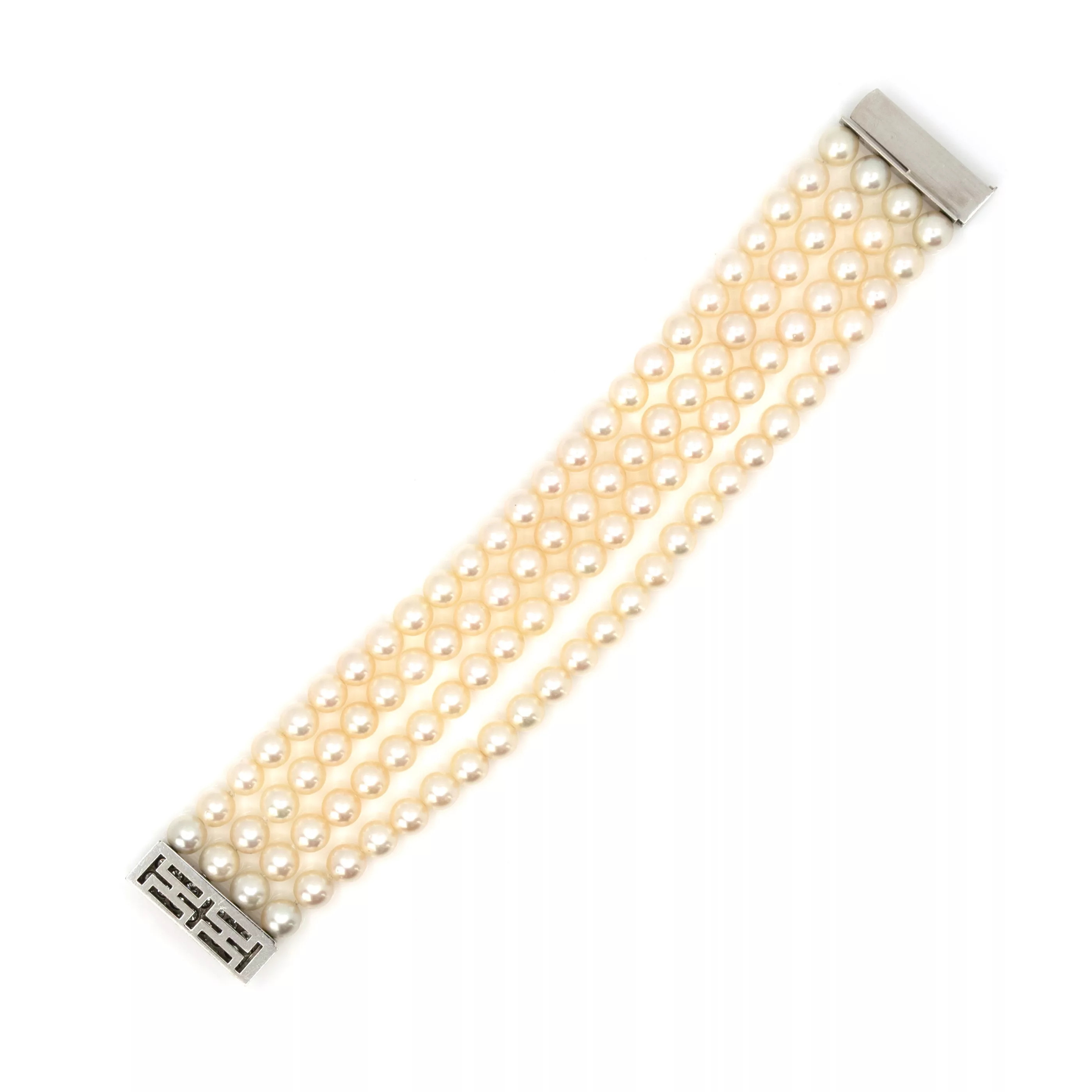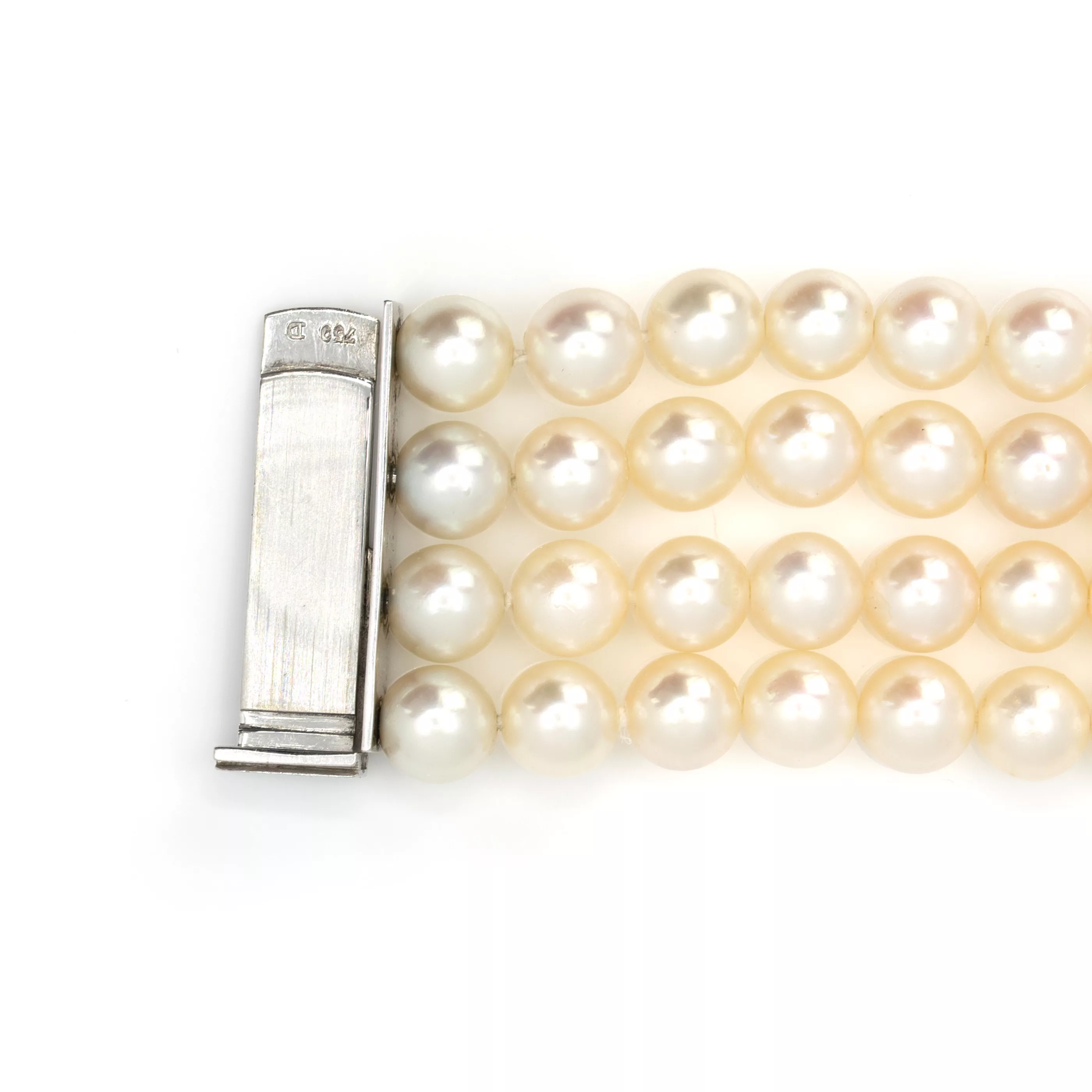 Schließe 750 Weißgold, punziert, Meisterpunze D, 16 Diamanten im Brillantschliff, gesamt ca. 1,90 ct, G-H, vvs, 4 Reihen Akoya-Zuchtperlen, Ø 6,9 - 7,3 mm, Länge 19 cm, Breite 3 cm, Gewicht ca. 73 g