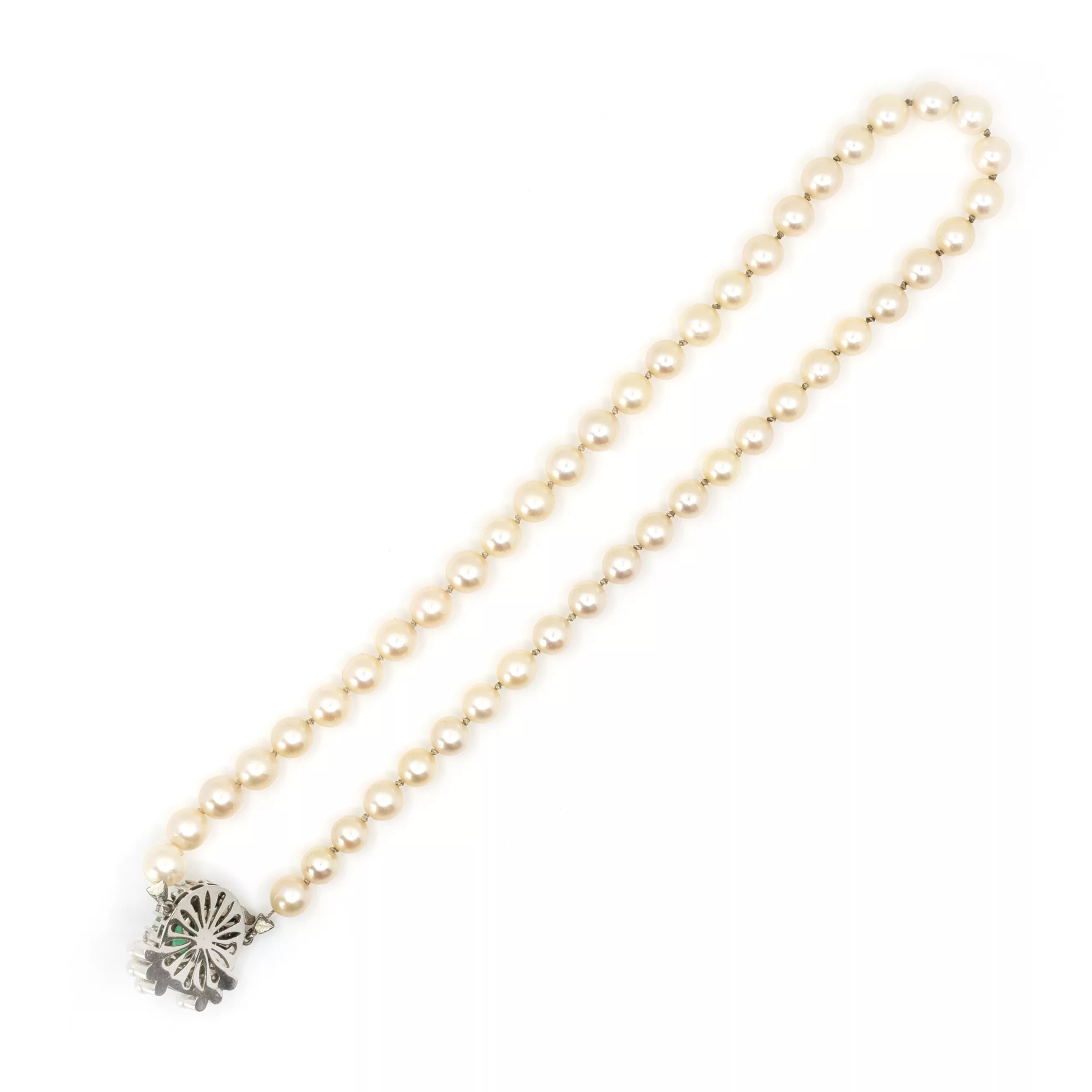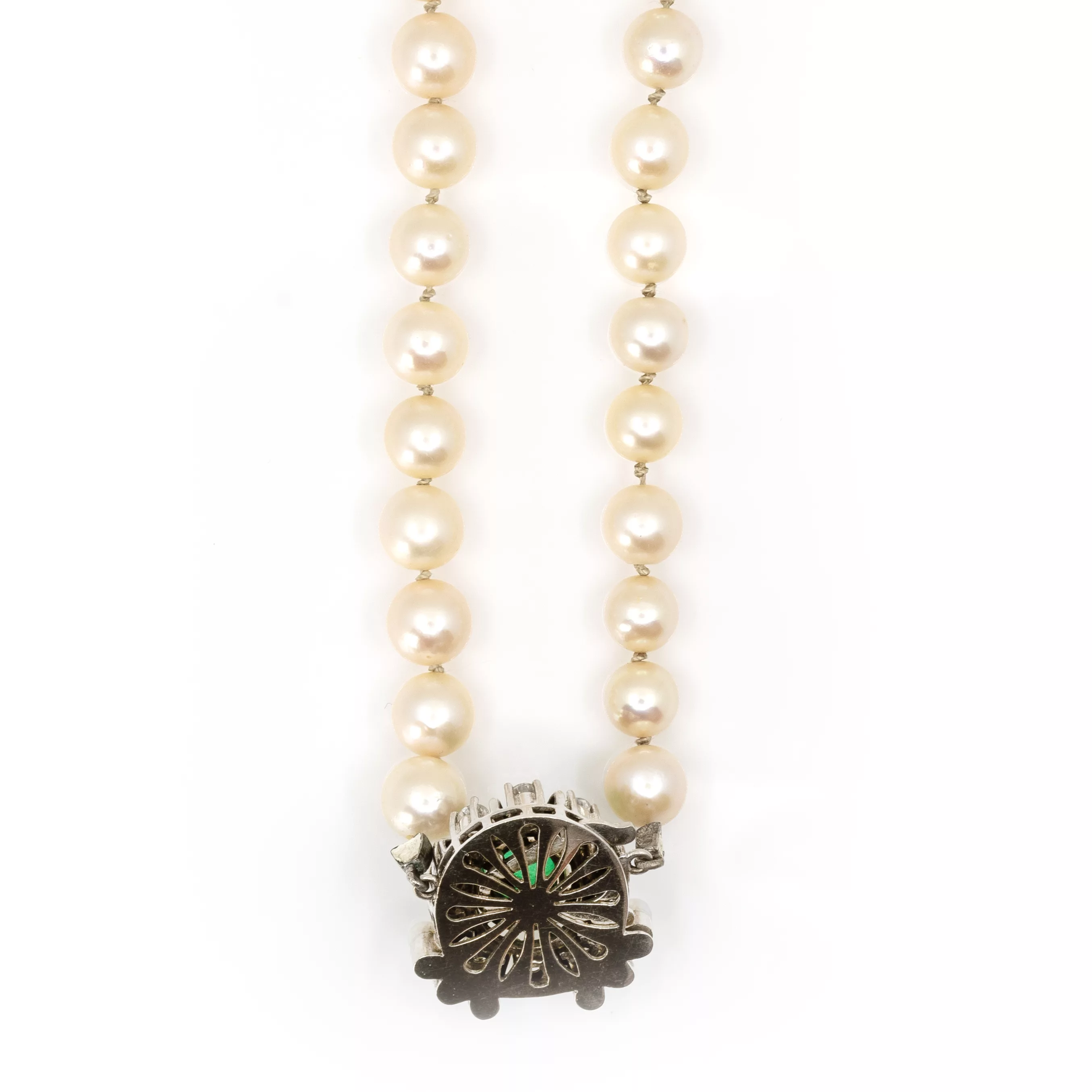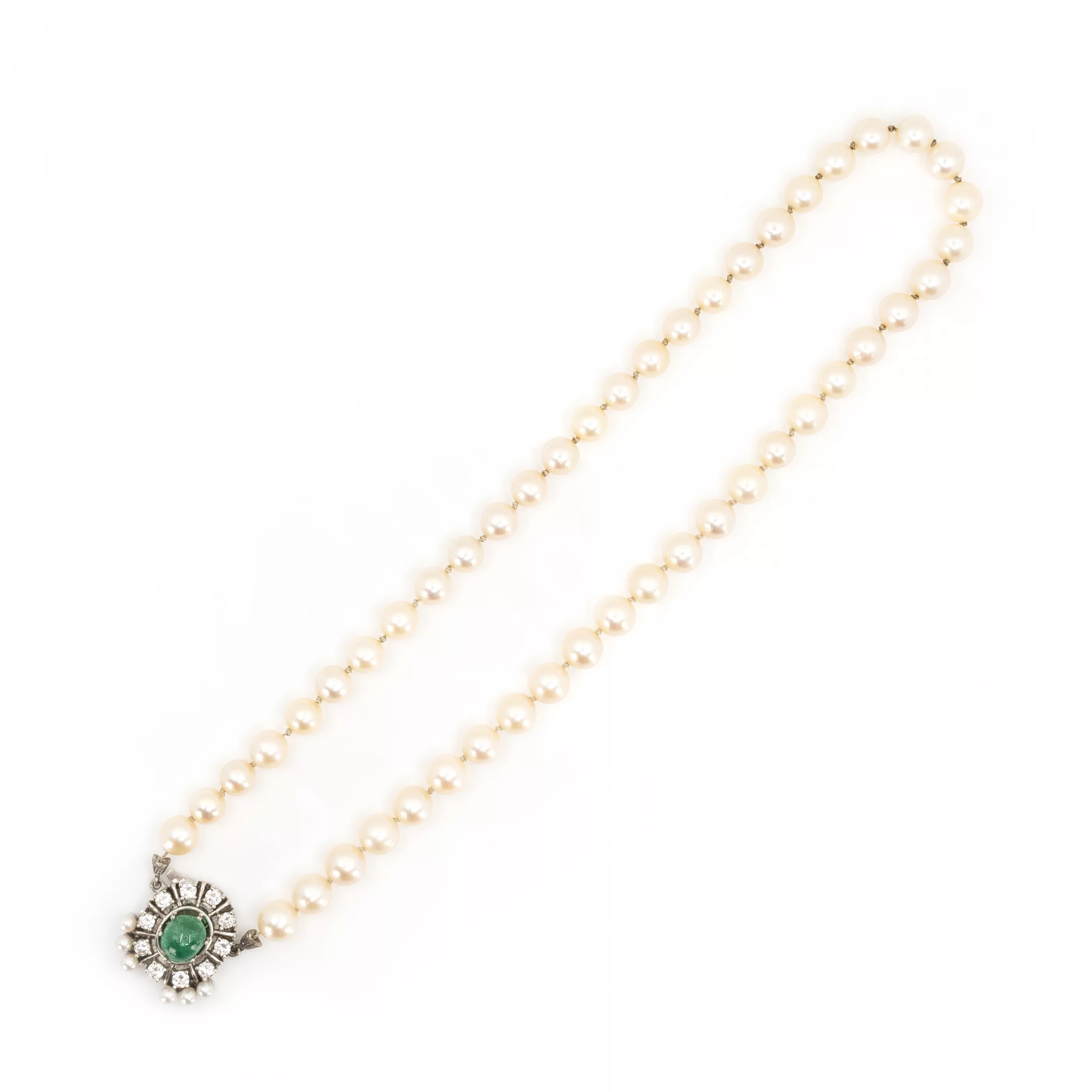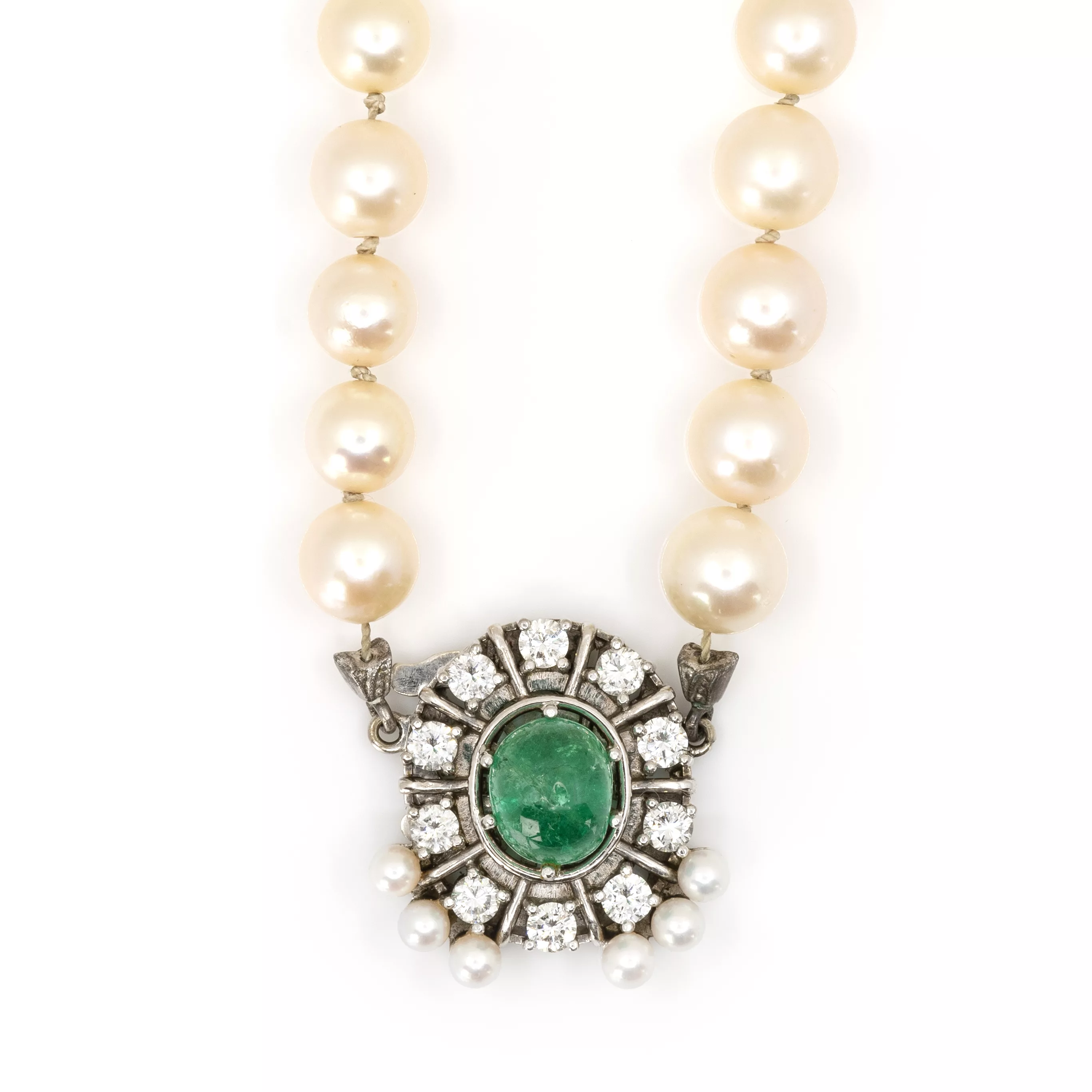 585 white gold, hallmarked, 10 brilliant-cut diamonds, total approx. 1.00 ct, H, vs, emerald cabochon, approx. 1.50 ct, length necklace 45 cm, Ø pearls 7.1 - 7.9 mm, weight approx. 38 g