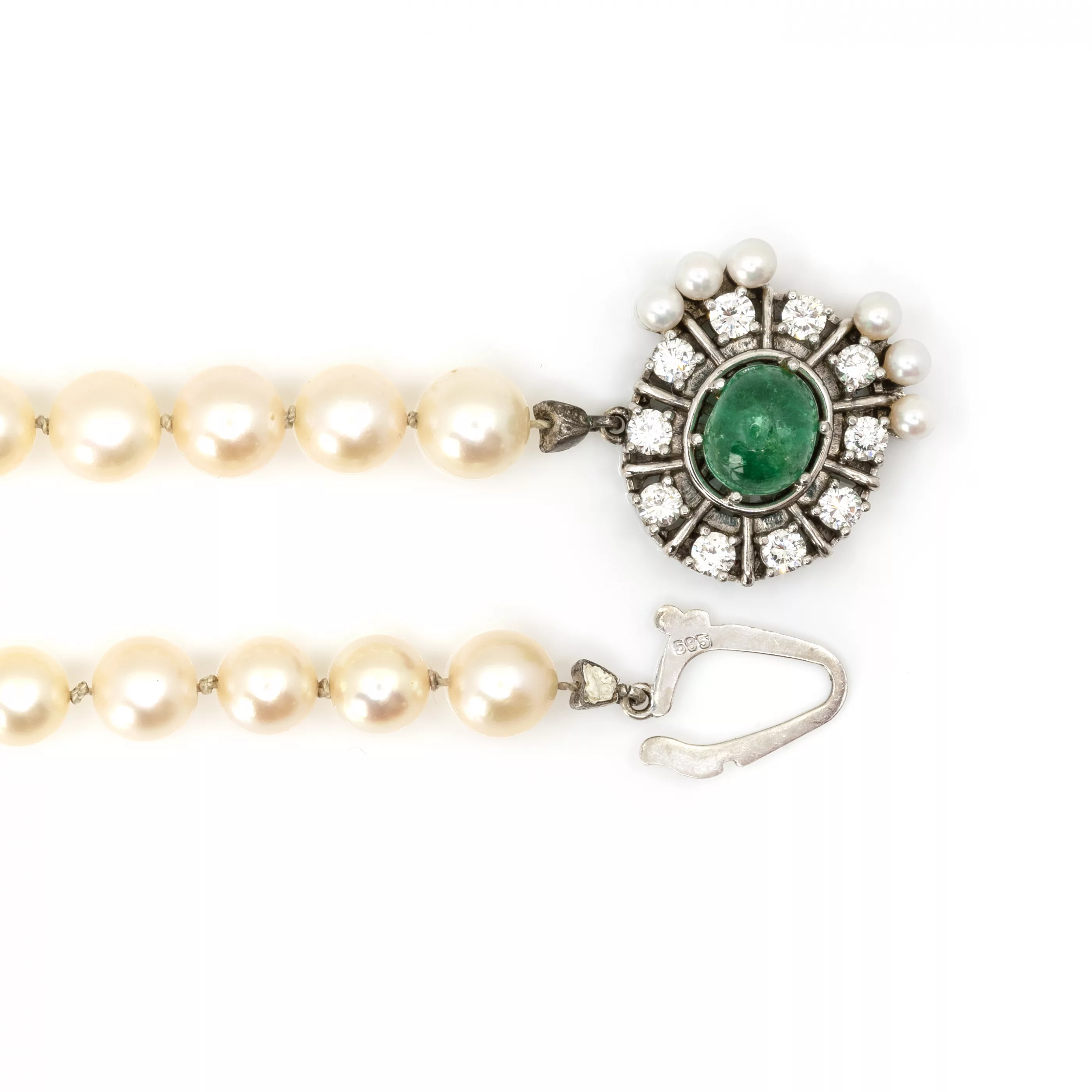 585 Weißgold, punziert, 10 Diamanten im Brillantschliff, gesamt ca. 1,00 ct, H, vs, Smaragd-Cabochon, ca. 1,50 ct, Länge Kette 45 cm, Ø Perlen 7,1 - 7,9 mm, Gewicht ca. 38 g