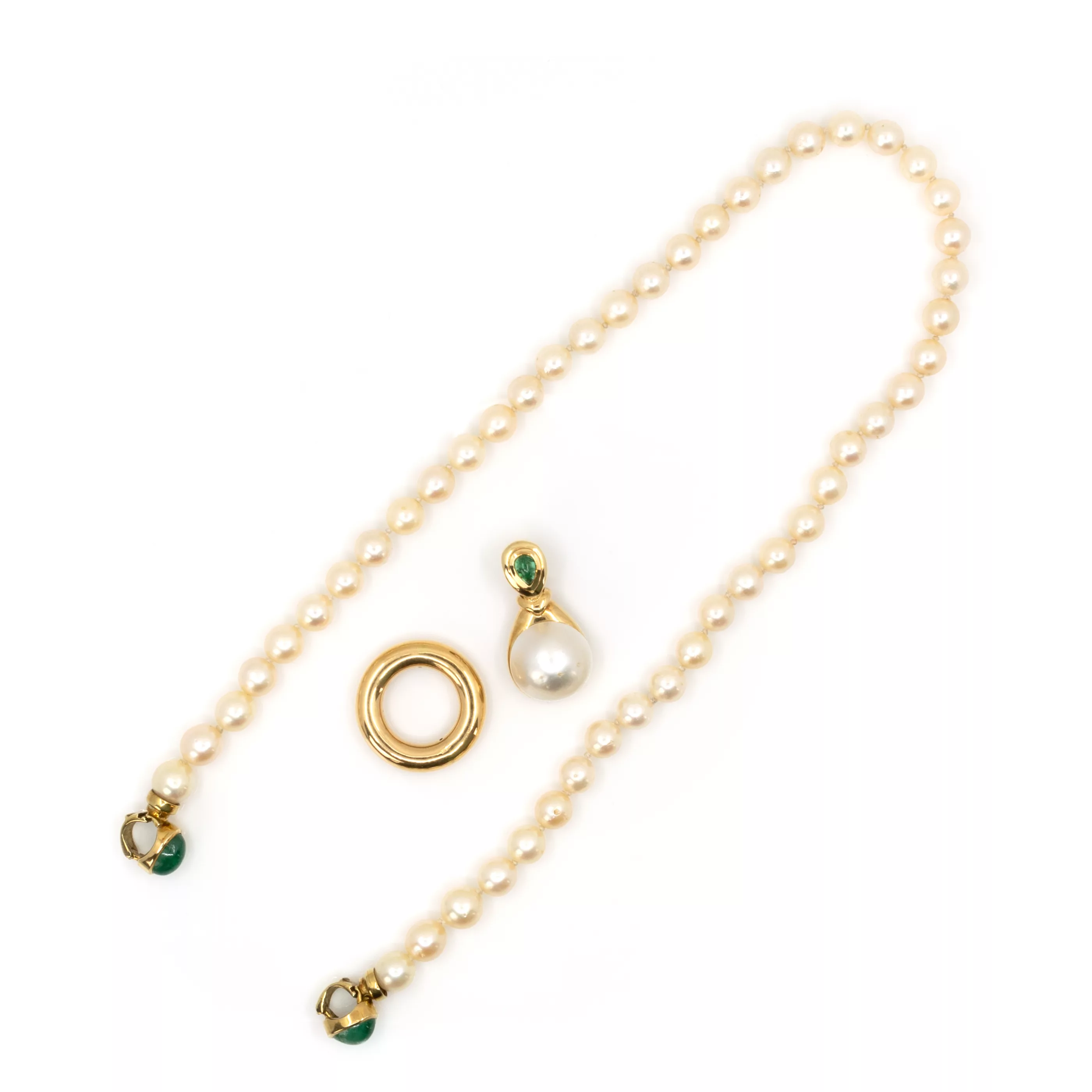 585 yellow gold, hallmarked, pendant with mabé pearl, pearl Ø 15.6 mm, 3 emerald cabochons, total approx. 4.95 ct, cultured pearls Ø 7 - 8.3 mm, length necklace 44 cm, length pearl pendant 3.2 cm, Necklace can also be worn without pendant, total weight approx. 47.3 g